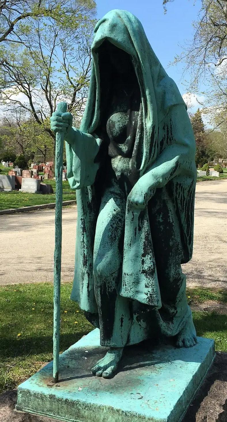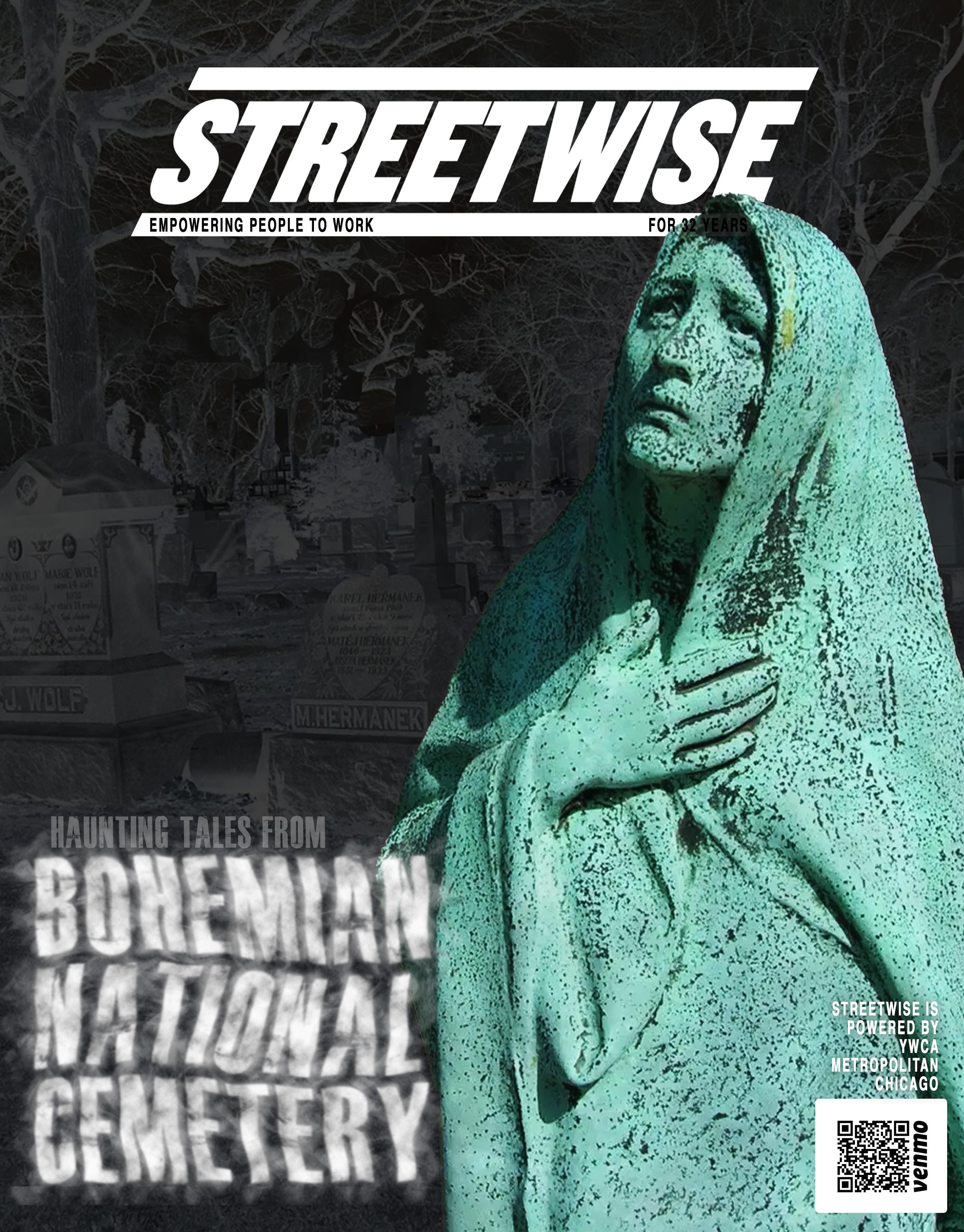 OM THE COVER: A Mother's Sorrow. THIS PAGE: "The Pilgrim" or "Death," a solid bronze by Albin Polasek, is caught mid-stride, headed toward the Stejskal Mausoleum. Legend has it that if she ever reaches her destination and enters the mausoleum doors, Doomsday has arrived. (Bohemian National Cemetery photo). DISCLAIMER: The views, opinions, positions or strategies expressed by the authors and those providing comments are theirs alone, and do not necessarily reflect the views, opinions, or positions of StreetWise.