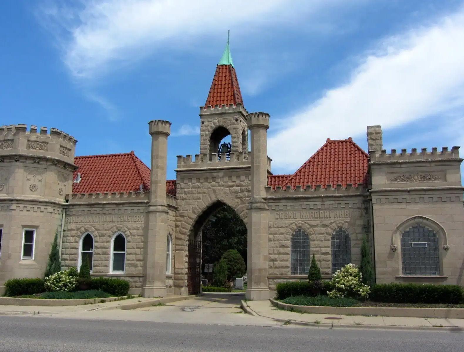 Since a decade after its opening, however, Bohemian National has been open to all ethnic groups and nonsectarian. Its 124 acres include 60 acres designed by landscape architect Jens Jensen in 1906. The 1893 gatehouse is Gothic Revival and the crematorium/columbarium, dedicated in 1919, is Renaissance Revival. The cemetery preserves American history through memorials to veterans of the Civil War, Spanish American War, and World Wars I and II.