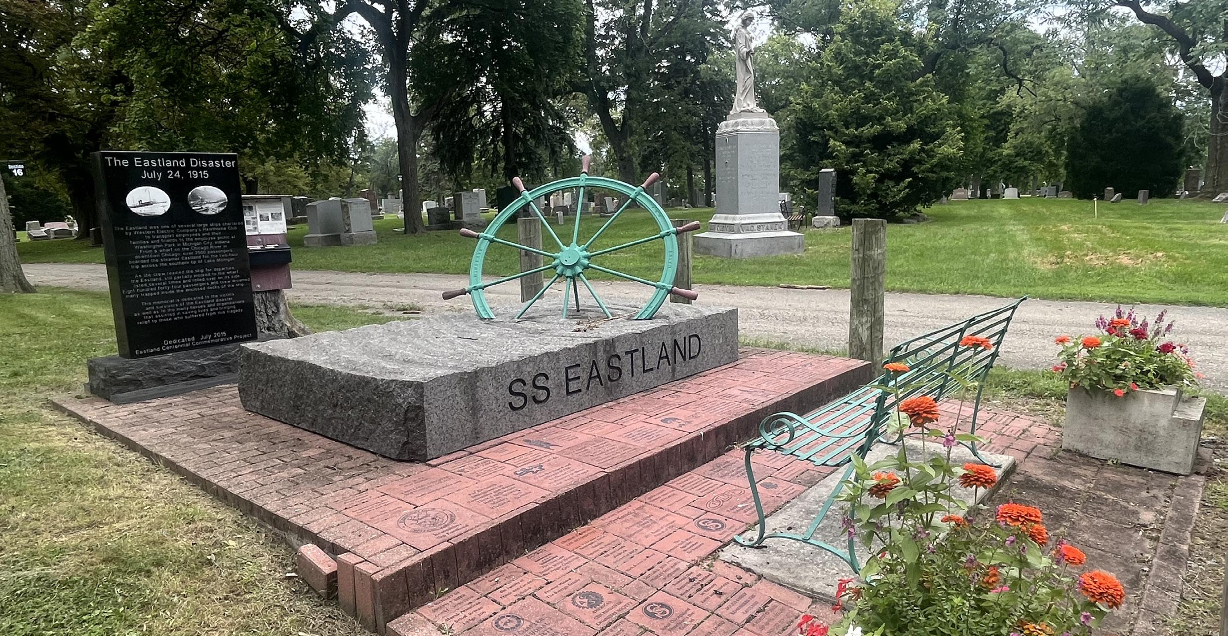 Section 16 also contains a striking memorial organized by the Eastland Memorial Commemoration Project in 2015. A bronze ship’s wheel protrudes from the river current above pavers from Czech community members, families whose relatives were not on board, first responders, even those who remember that Marshall Field employees brought blankets to the disaster site.