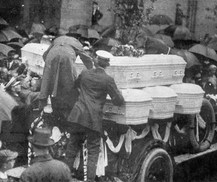 Nearly 700 of 844 Eastland Disaster victims were buried on Wednesday, July 28, 2015. There weren’t enough hearses in Chicago, so Marshall Field’s provided 39 trucks.