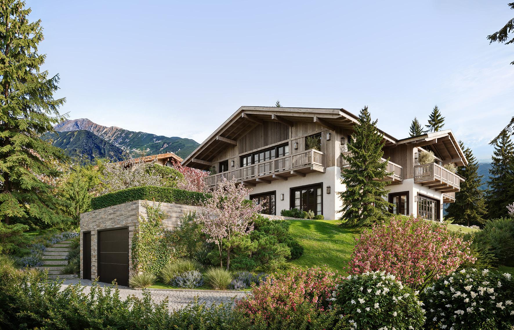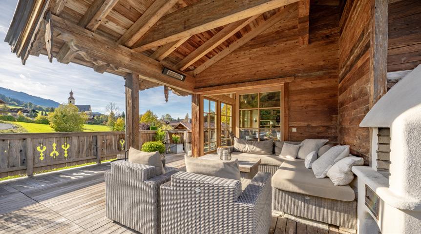bekommt dieser Raum eine besondere Note – man möchte gerne bleiben und genießen. Die Sitzgruppe positioniert sich um den offenen Kamin. Vor der Küche lädt ein breiter Balkon zum Essen im Freien ein. Auf der anderen Seite ist die lauschige Terrasse samt Kamin und mit überdachtem Freisitz eine geniale Erweiterung des Wohnzimmers zu jeder Jahreszeit. Die verwendeten Materialien sind hochwertig und zeitlos mit elegantem Touch, das Farbkonzept ebenso. Dadurch kann der persönliche Geschmack des neuen Eigentümers spielerisch eingebracht werden, sodass sein personalisiertes Zuhause in den Tiroler Bergen entsteht. Fahrzeuge finden ausreichend Platz in fünf Garagen sowie in der privaten Zufahrt zum Haus.