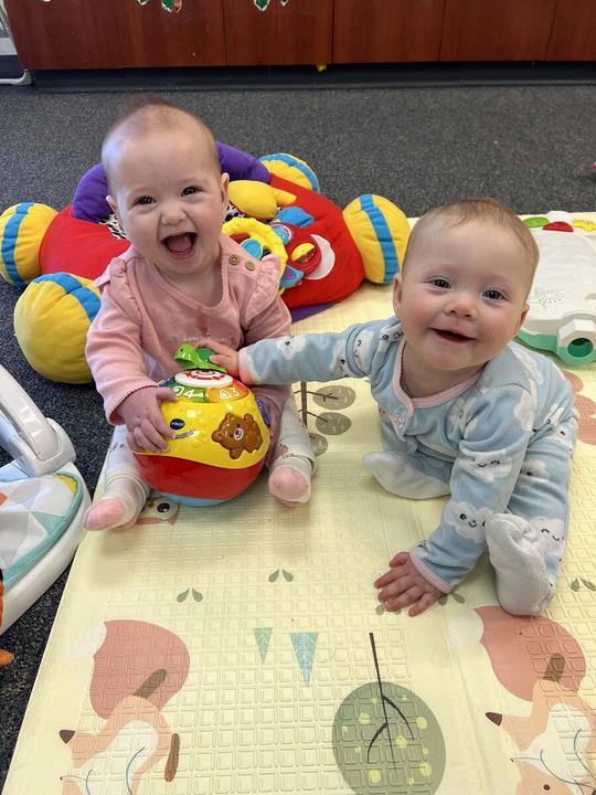8. Infants Talia R. and Miriam G. sharing smiles as they enjoy playtime.