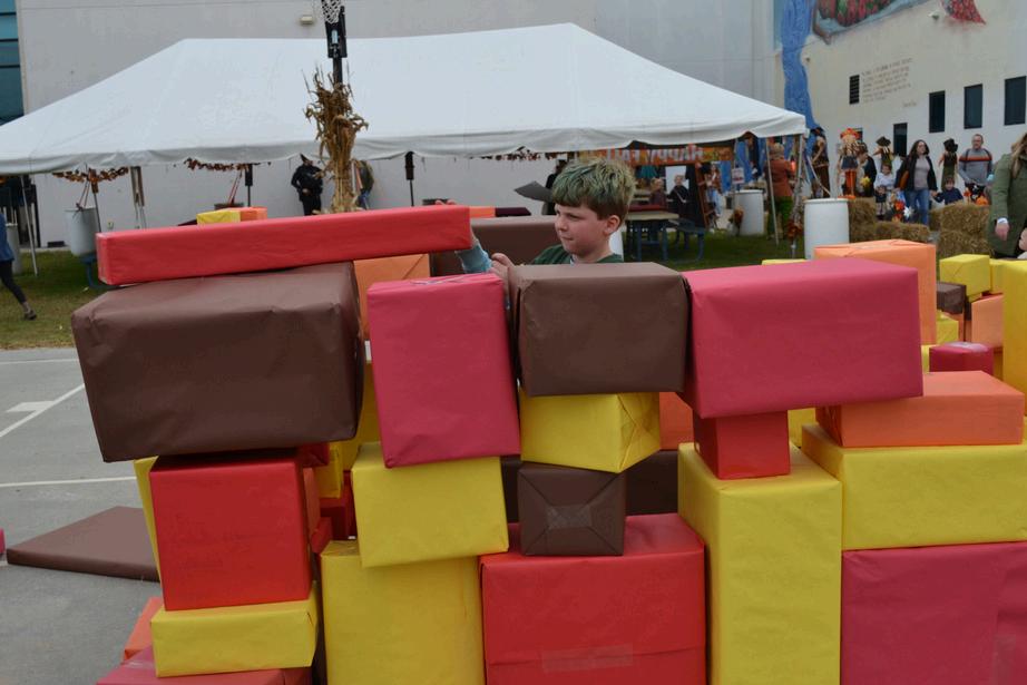 Raleigh A. stacks fall-colored blocks to build an impressive tower.