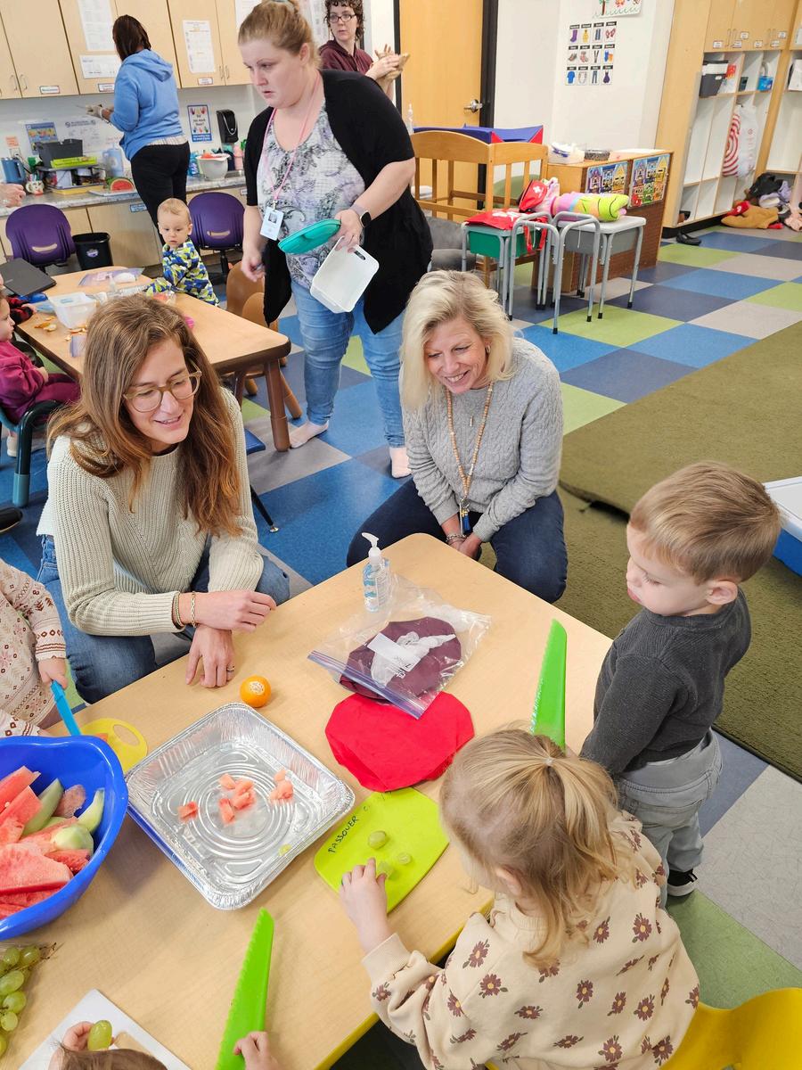 Heather Moore joins the toddlers as they help prepare fruit salad for the annual Friendsgiving feast.
