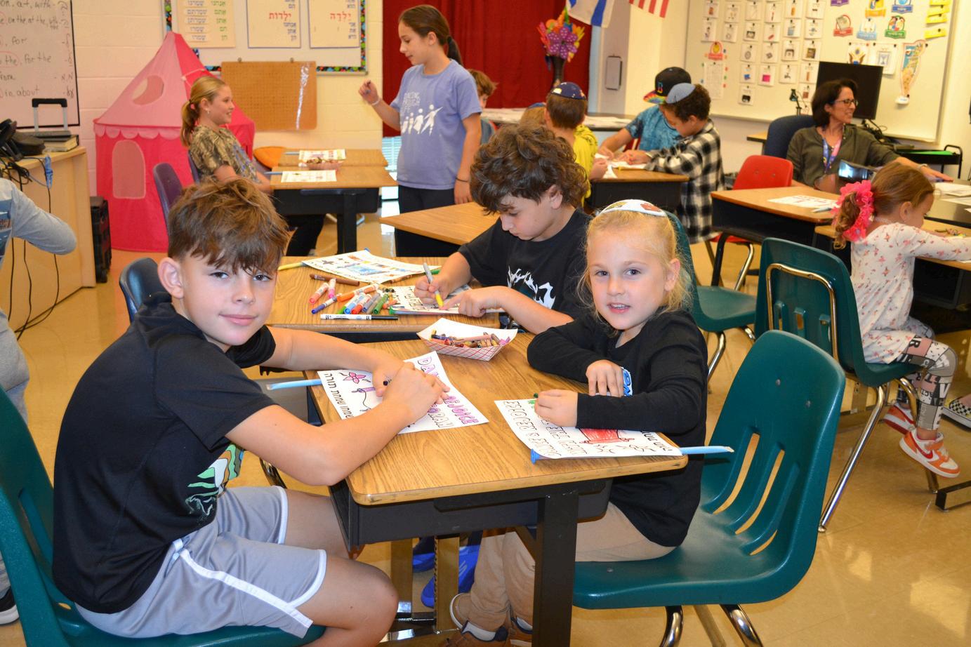 3. Fifth grader Honzi H. and kindergarten student Henry T. color their flags together in celebration of Simchat Torah.