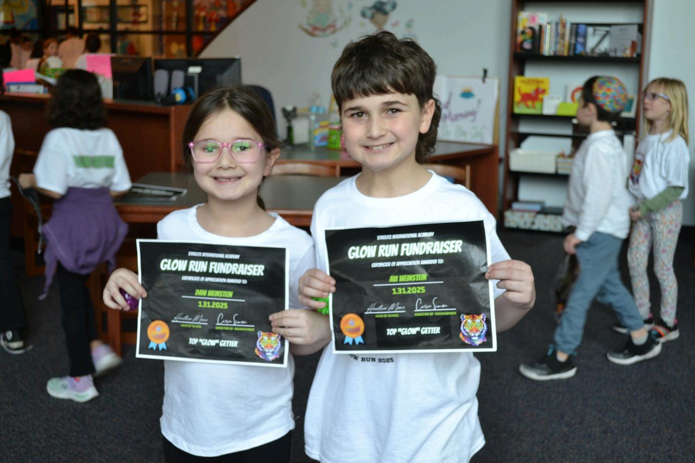 Dani W. and Avi W. pose with their fundraising certificates at the conclusion of the 2025 Glow Run.