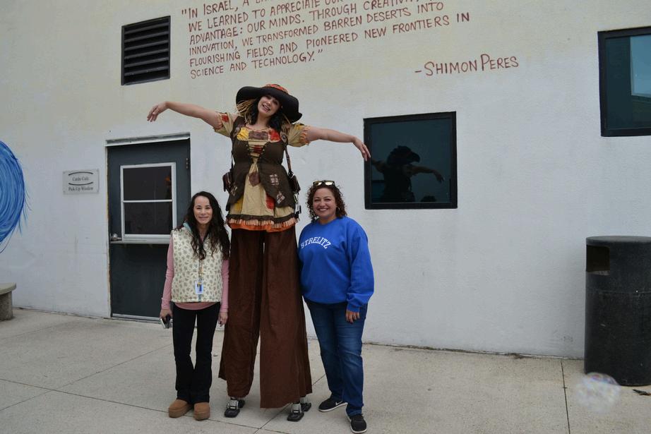 Business Manager Irina Komarovsky and Assistant Director of Early Years Veronica Samonte pose with the very tall scarecrow.
