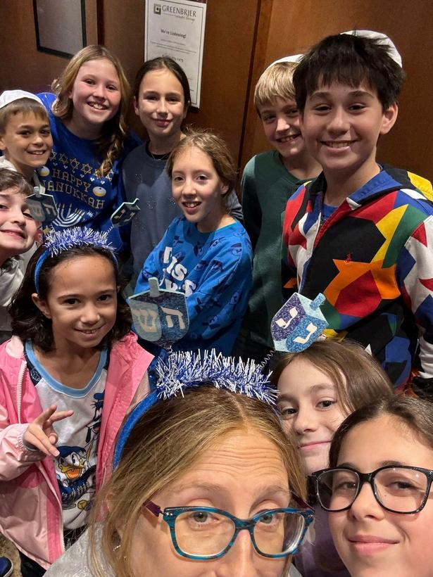 Fifth graders snapping a quick selfie with Mrs. B before heading in to spread Chanukah cheer.
