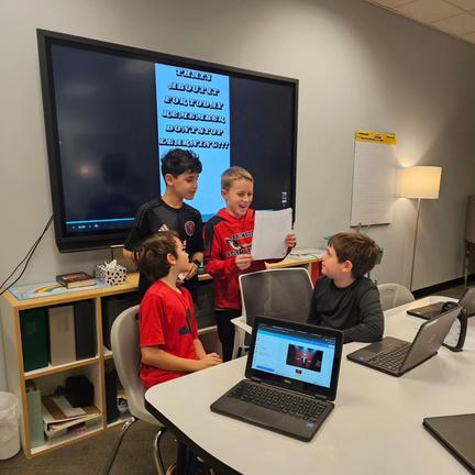 Fourth graders Daniel S., Luke K., Benjamin T. and Benjamin S. present to their classmates and first graders, demonstrating key IB learner profiles like communicators, thinkers, and risk-takers.