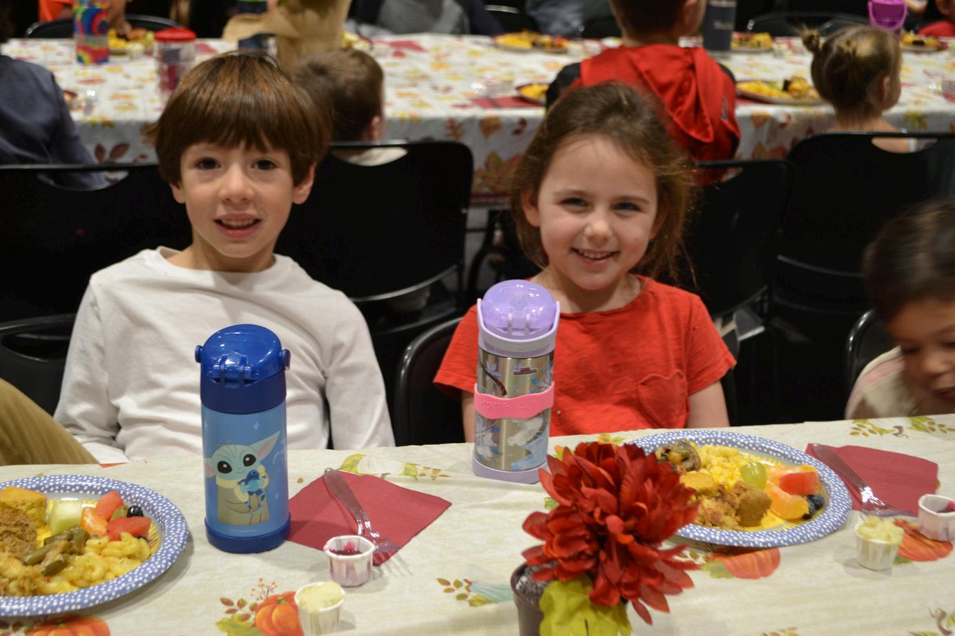 5. Second grader Johnny A. and EY4 student Brynn W. enjoying a meal together at the schoolwide annual Friendsgiving feast.