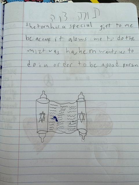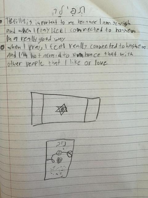 Fifth grade students maintain a Tefillah Journal. The use of the Tefillah Journal allows students the opportunity to personally reflect on the different Tefillot and find meaning in each of the prayers. Students use writing, drawing and poetry as they reflect in their Tefillah Journals. Students are encouraged to be “risk takers” and share their reflections in class after completing their work.