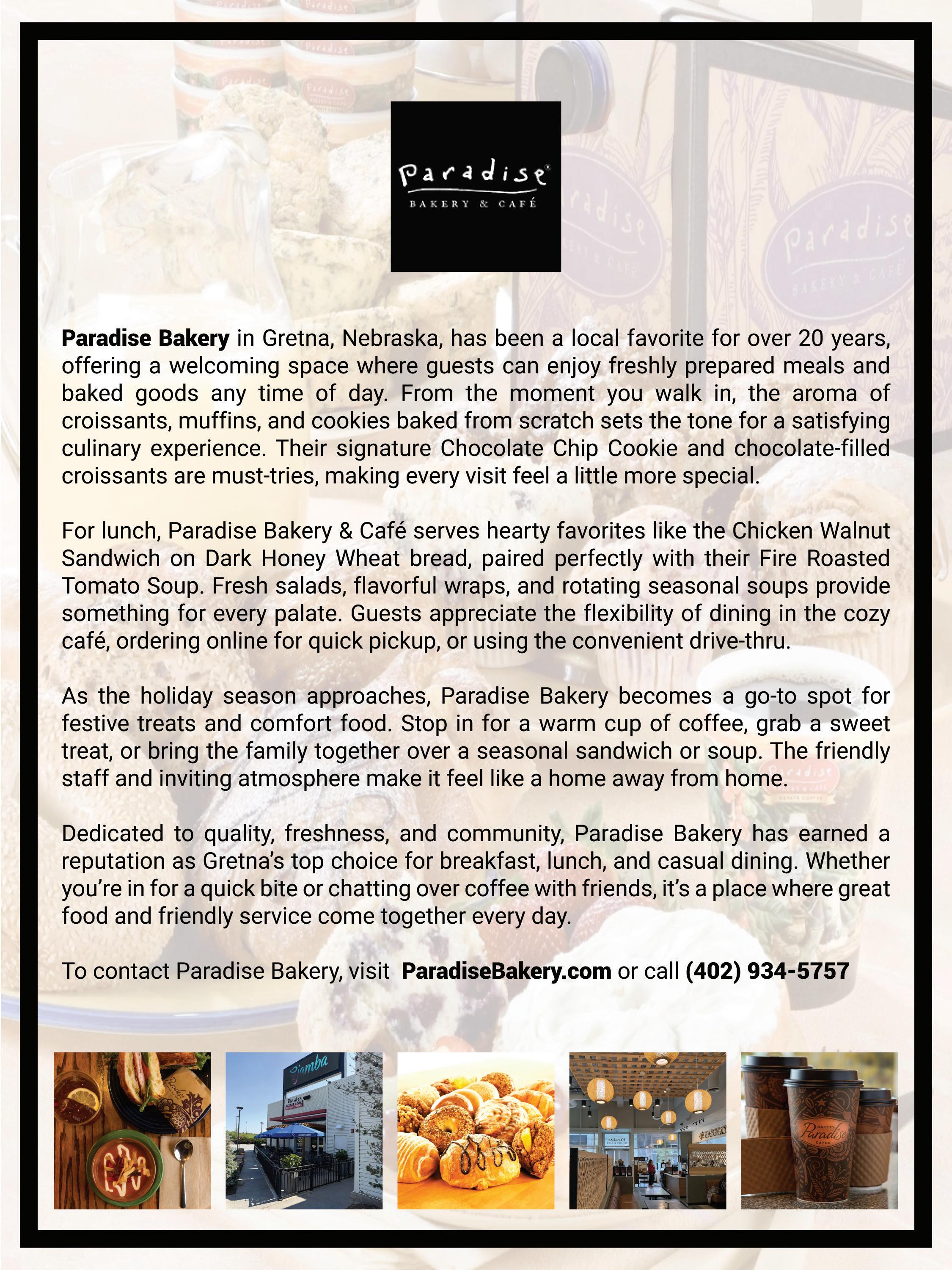 And to top off your holiday mornings, whether they are chilly and dark or busy and bright, Paradise Bakery in Gretna, Nebraska, can supply you with baked goods made fresh every morning and a cup of coffee or tea to keep your spirits high. Paradise Bakery helps make corporate gatherings truly special. Known for its freshly baked treats