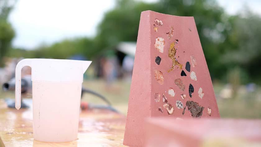 Az alkotás a zuzmók rejtélyes világa előtt olyan módon tiszteleg, hogy az apró élőlényeknek megpróbálja a lehető legoptimálisabb tapadási felületet biztosítani. A vas-oxiddal színezett piros, narancssárga vagy lazac színű betonból és válogatott kavicsokból álló szeletkék mindegyike más és más felülettel rendelkezik. Az alkotási folyamatot egy nagy túra előzte meg a Pilisborosjenőt övező erdőkben, melynek során az alkotók azt vizsgálták, hogy a zuzmók természetes előfordulási helyükön milyen feltételek mellett érzik jól magukat. Tehát mennyi ott a napfény, mennyi a nedvesség, pára, rücskös vagy inkább sima a felület, ahol meg tudtak telepedni. A szobordarabokat készítőik ezen tapasztalatok és inspirációk mentén csinálták meg. Természetes anyagok, különféle kavicsok, adalékanyagok és beton keveredése, talányos formák jellemzik őket. A különbözőség biztosítja a heterogenitást, a későbbiekben sokféle zuzmófaj megjelenését indukálva.