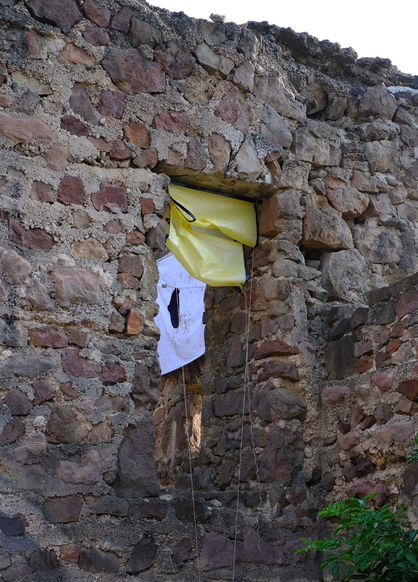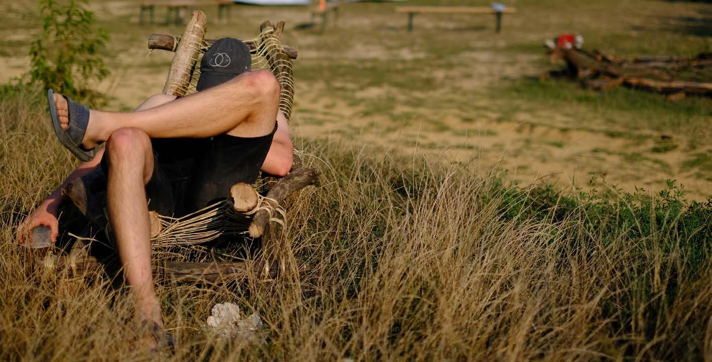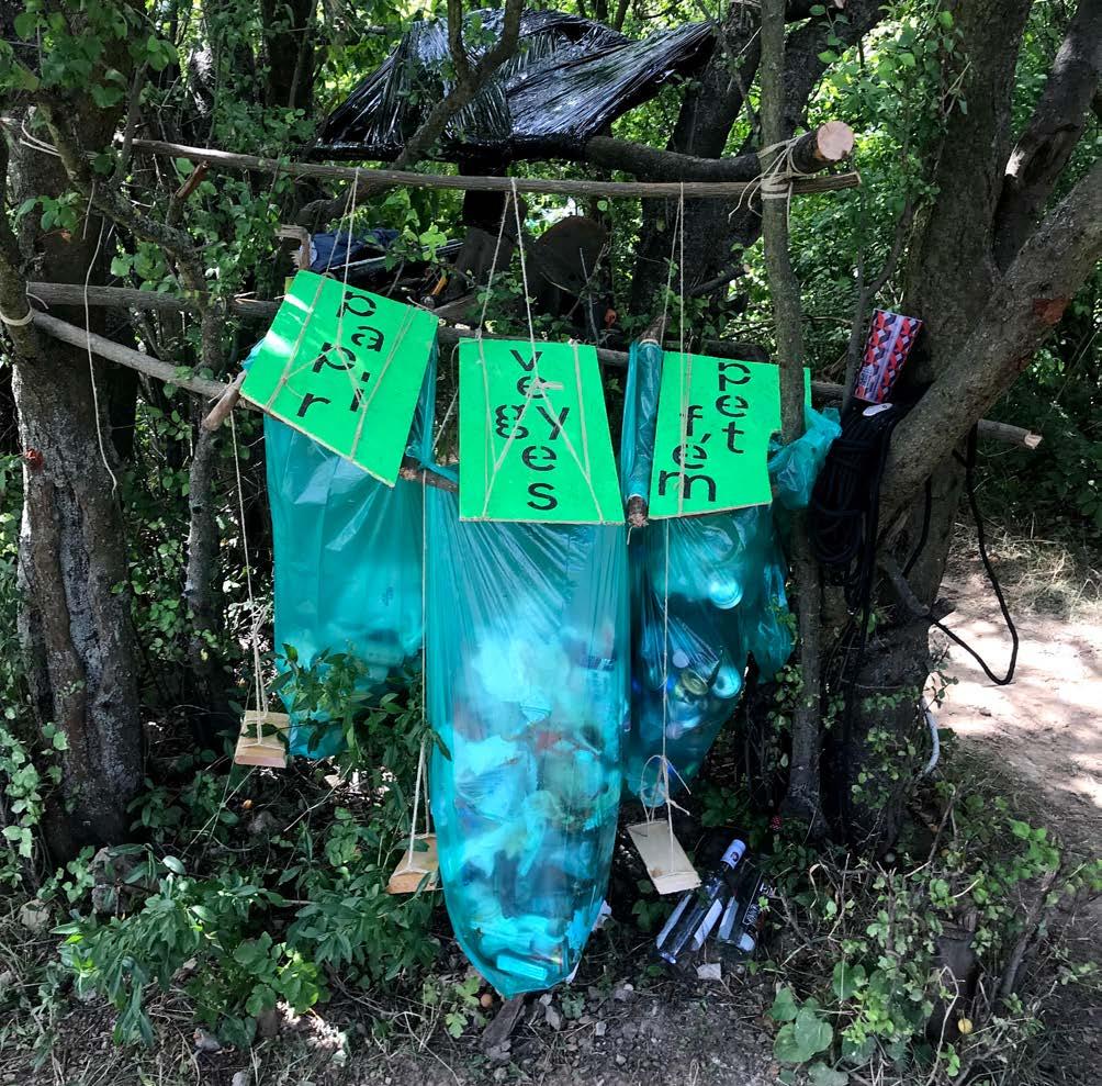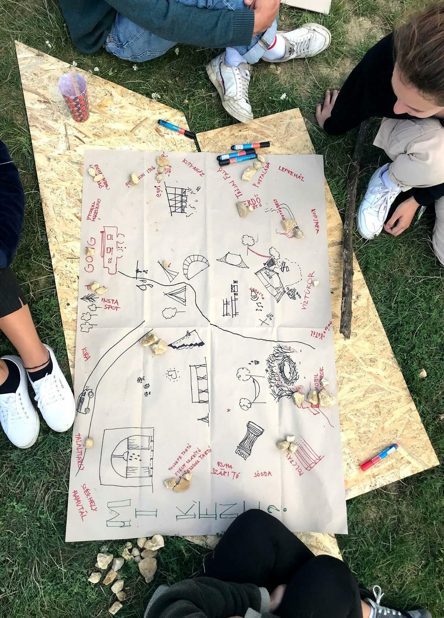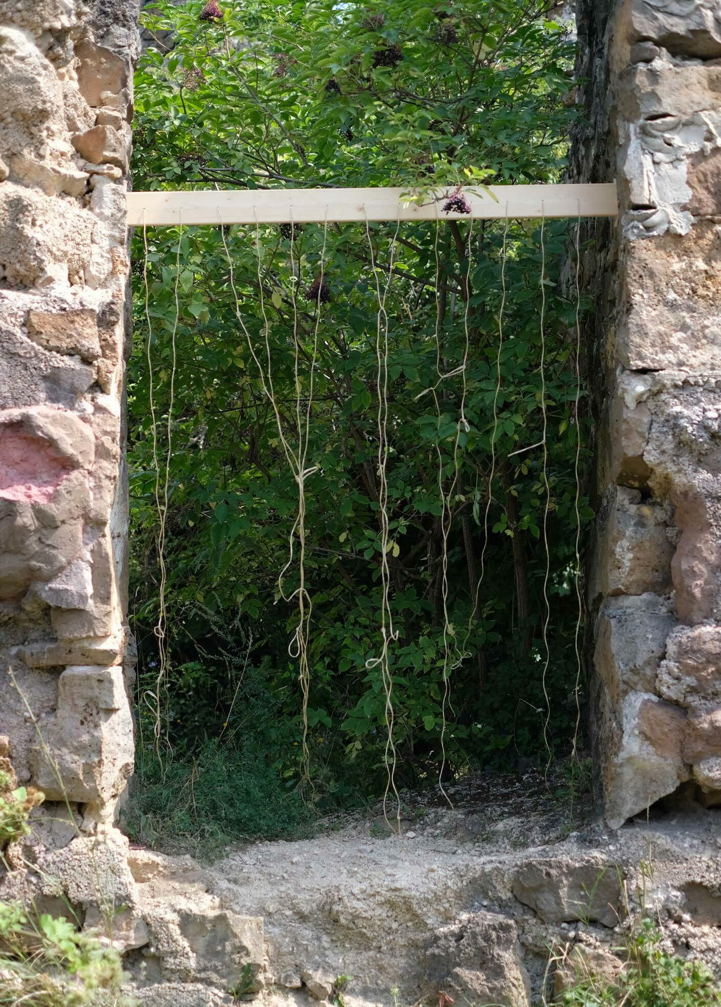 Fészekrakás közben azon töprengtünk, mi az, ami a természetben az emberi jelenlét első jele, szükségszerű eleme. Mitől válik a tisztás agorává, a lugas hajlékká, a természet otthonná. Vajon mi az a minimális beavatkozás, amitől élettérré alakul a lakatlan. Körbejárva a várat mentális térképet rajzoltunk, priorizáltuk szükségleteinket: szerszám tároló, szemetes, kézmosó, mosogató, szárító, polc, fogkefetartó, tűzhely, fotel, dob.