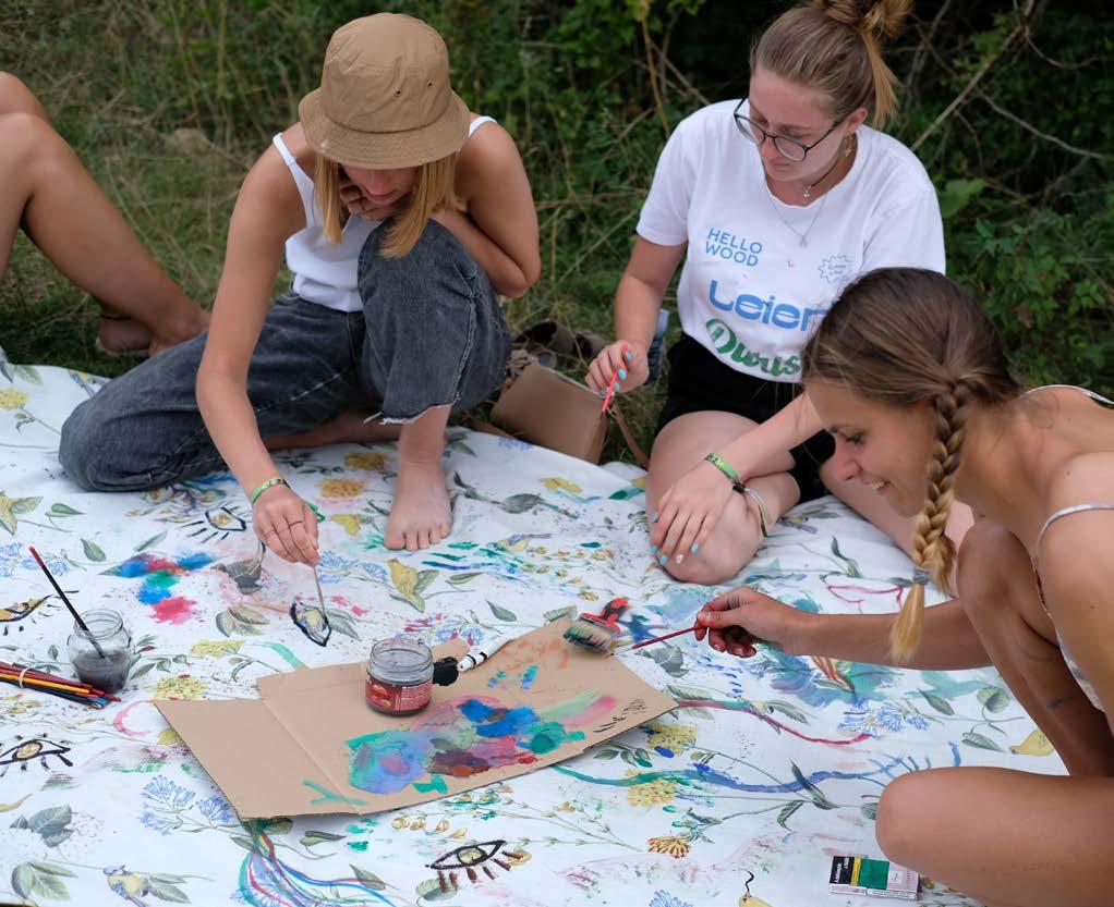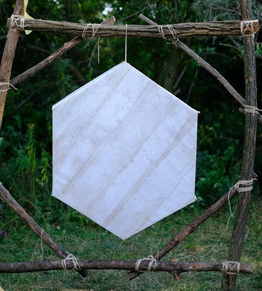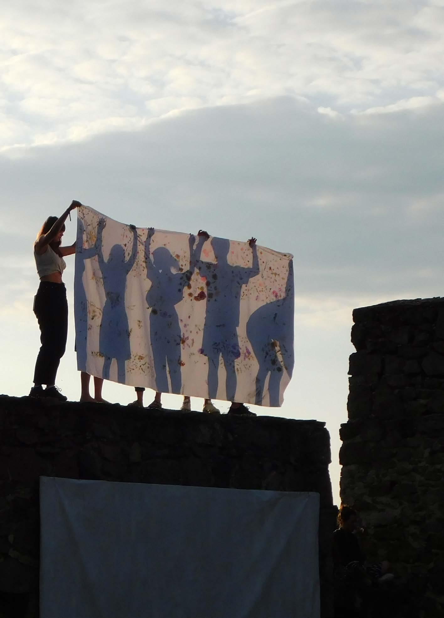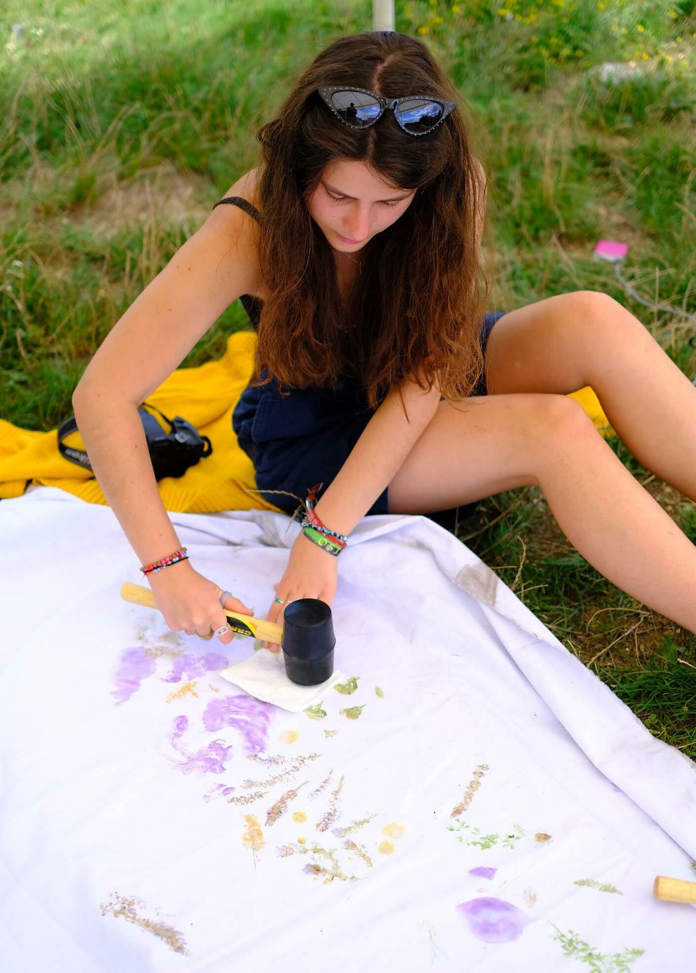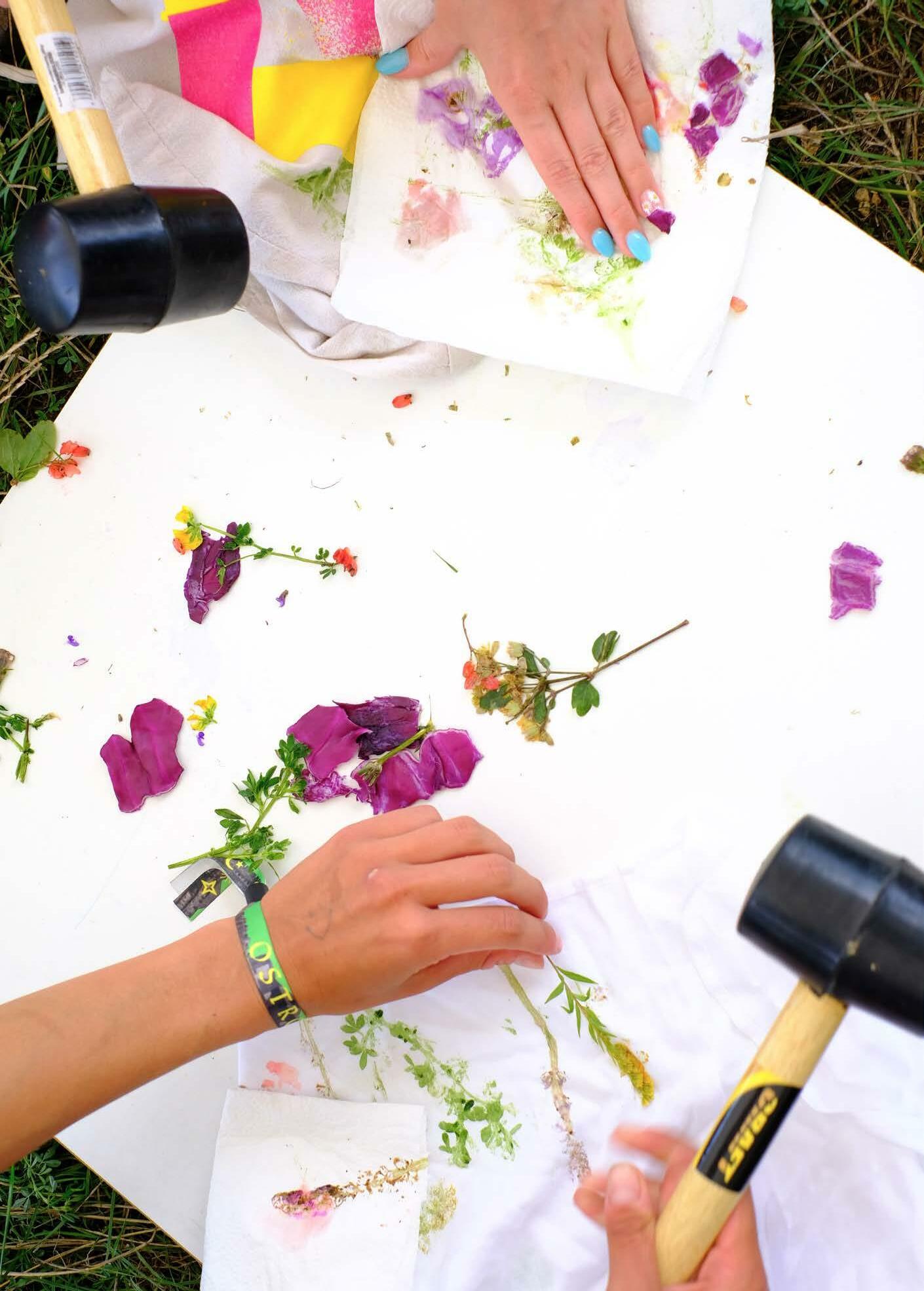 A “Virágü(lte)tés” című workshopon az ecoprint technikát fedeztük fel a Pilisben található növényeket összegyűjtve és felhasználva. A technika során a kiválasztott színes növényekből egy kalapács segítségével juttattuk át a vászonra a belőlük kinyert pigmenteket, amiket aztán vasalással rögzítettünk. Mivel a módszert igen gyorsan el lehet sajátítani, a résztvevők nem a teljes hetet töltötték a workshopon, hanem szabadon lehetett csatlakozni a folyamathoz. A hét során mindenkinek lehetősége volt hozott ruhákra is printelni, illetve közösen készítettünk egy 1,5x6 méteres lenyomatolt textilt, amit az utolsó napon kitűztünk a várfalra is, zászló gyanánt.
