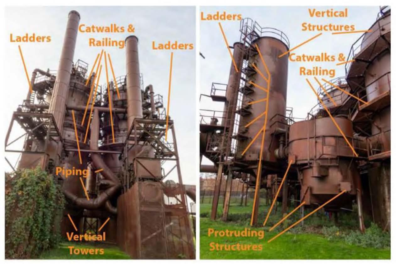 The pedestrian appurtenances attached to the cracking towers were originally installed for maintenance of the gasification equipment. These structures are “designed to convey human beings vertically and horizontally along the towers.”5 “[M]any of these elements are severely deteriorated and many of the attachments have failed or are at point of failure.”6