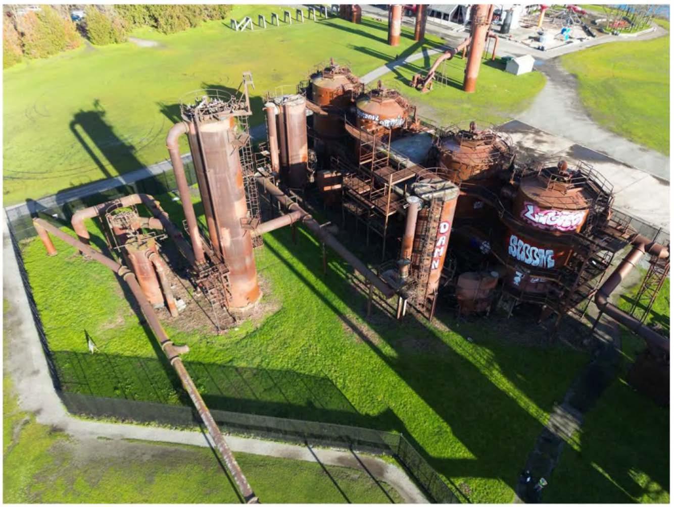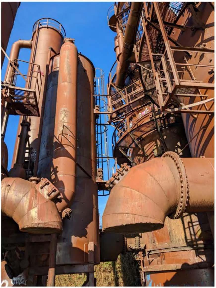 The City’s safety concerns were not limited to unauthorized climbers. In 2024, SPR recorded that a small ladder-tower structure within the cracking-tower area was leaning and was being prevented from falling only by a horizontal pipe flange, making it unsafe for SPR staff to enter the area for maintenance, graffiti removal, and trash removal.46 The same record stated that one support was fractured at the base and another was so badly corroded that steel was peeling