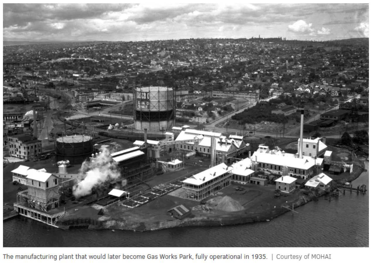 Gas Works Park “contains a former coal and gasification plant that operated from 1906 to 1956, which is comprised of several towers, tanks, piping supports, railings, ladders, and catwalks.”1 The conversion of the industrial ruin to a public park was the design of landscape