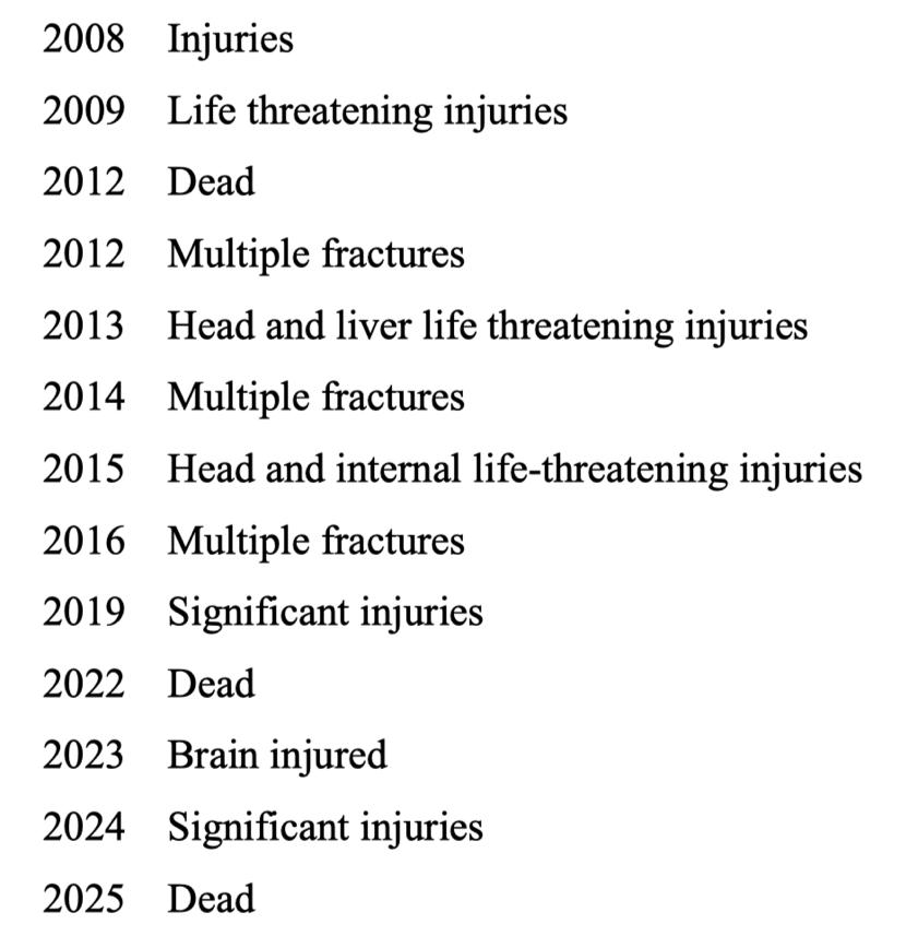 Other documented incidents include life-threatening head and internal injuries in 2015, an open femur fracture and possible pelvic fracture after a 2016 fall through a hole in a catwalk, and a 2023 fall that left a 16-year-old survivor with brain damage.12