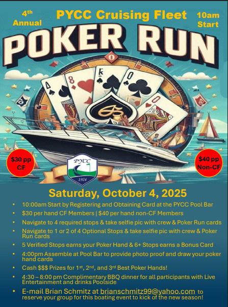 We’ll hoist the sails and kick off our new cruising season with full-hearted excitement at the 4th Annual PYCC Poker Run on Saturday, October 4. Fear not, sailors—there’s still time to sign up for this high-spirited event, featuring a BBQ feast and a lively poolside dance to launch the season in true nautical style. Whether you command a nimble dinghy, a trusty center console, or a majestic yacht, this is your chance to hoist the Jolly Roger in pursuit of the winning poker hand—and some bountiful cash prizes!