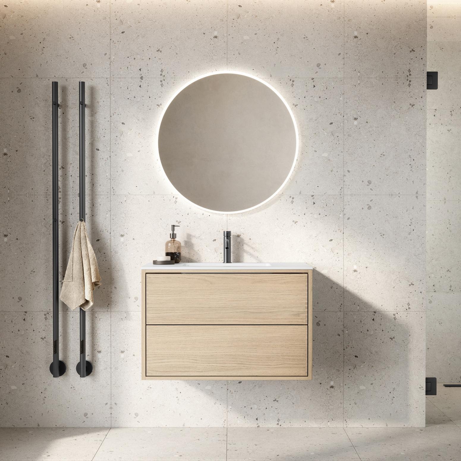 Hvert eneste detalje er gjennomtenkt - detalje er gennemtænkt – fra de fingertapped eiketreskuffer med push open og soft close funksjon, til den våtromsforseglet konstruksjon, der sikrer lang levetid i badeværelsets krævende miljø.