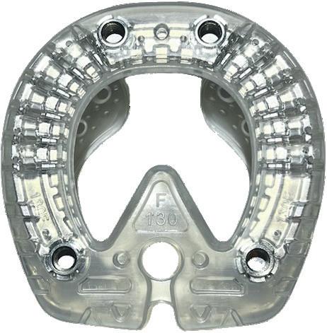 The EasyShoe Speed Metal Trac is a hybrid glue-on/nail-on urethane horseshoe with aluminum inserts and 4 threaded inserts for optional 3/8” studs. Glue using the integrated cuffs or remove the cuffs to nail the shoe. The Speed Line has thinner webbing to increase traction, making it ideal for performance disciplines. Available in full urethane (EasyShoe Speed) and threaded inserts for 3/8” studs (EasyShoe Speed Metal Trac).