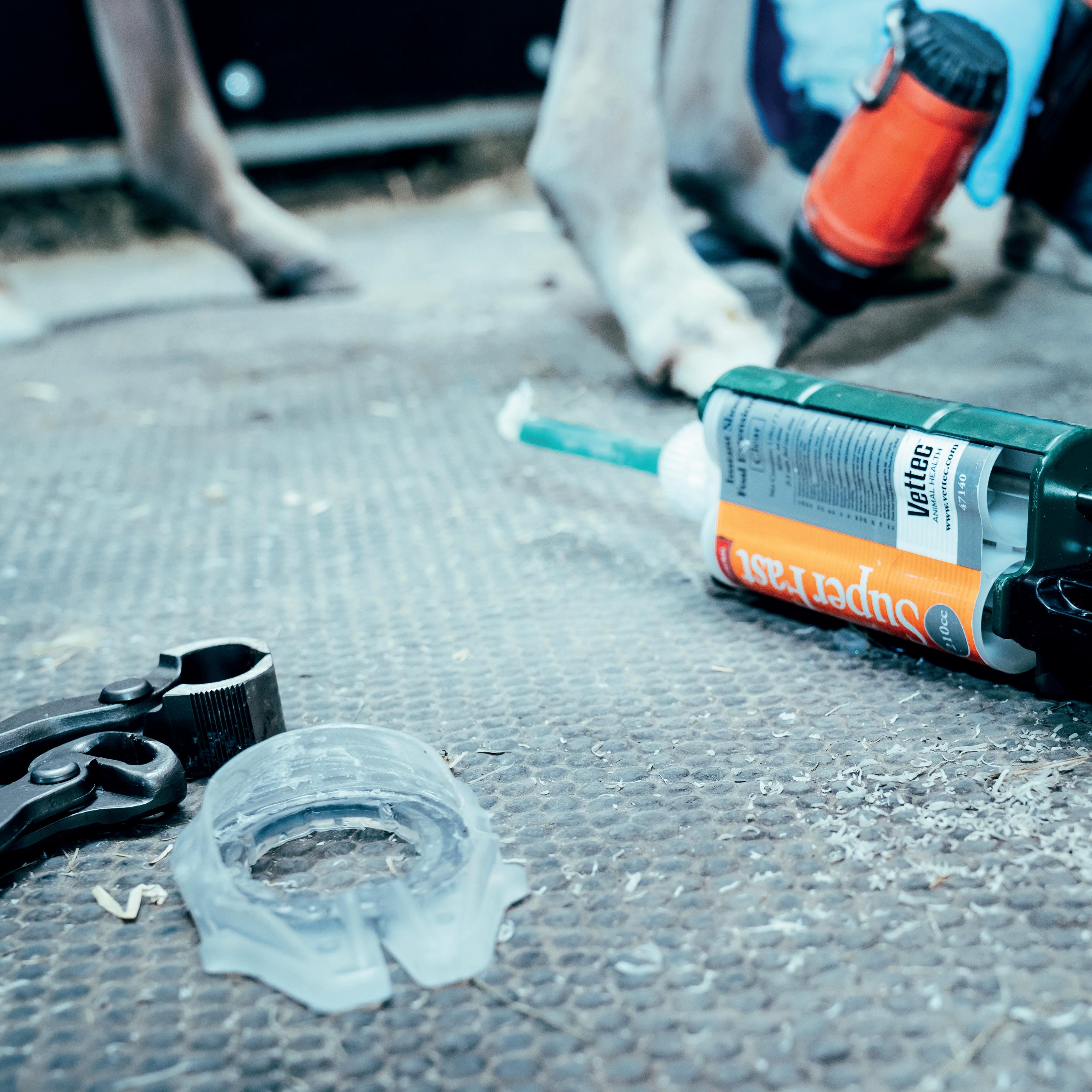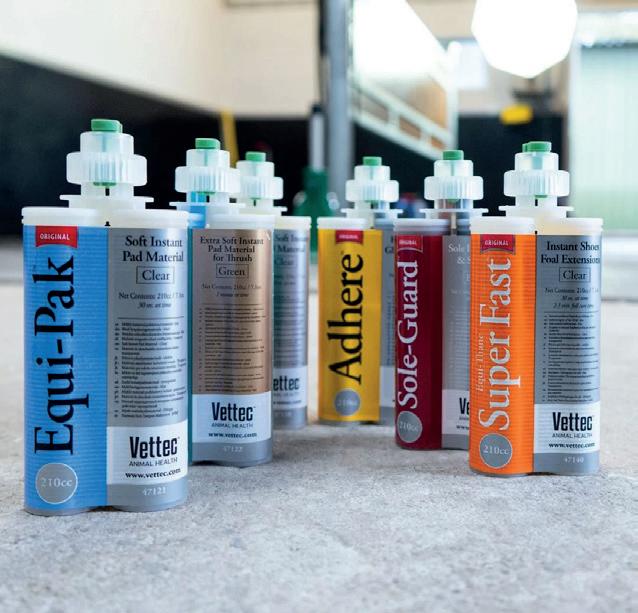 Vettec Adhere can be used for small and large hoof repairs and for gluing on shoes. It bonds to steel and aluminum. Vettec Adhere is excellent for urethane glue-on shoes and boots. It flexes like hoof wall and can be nailed.