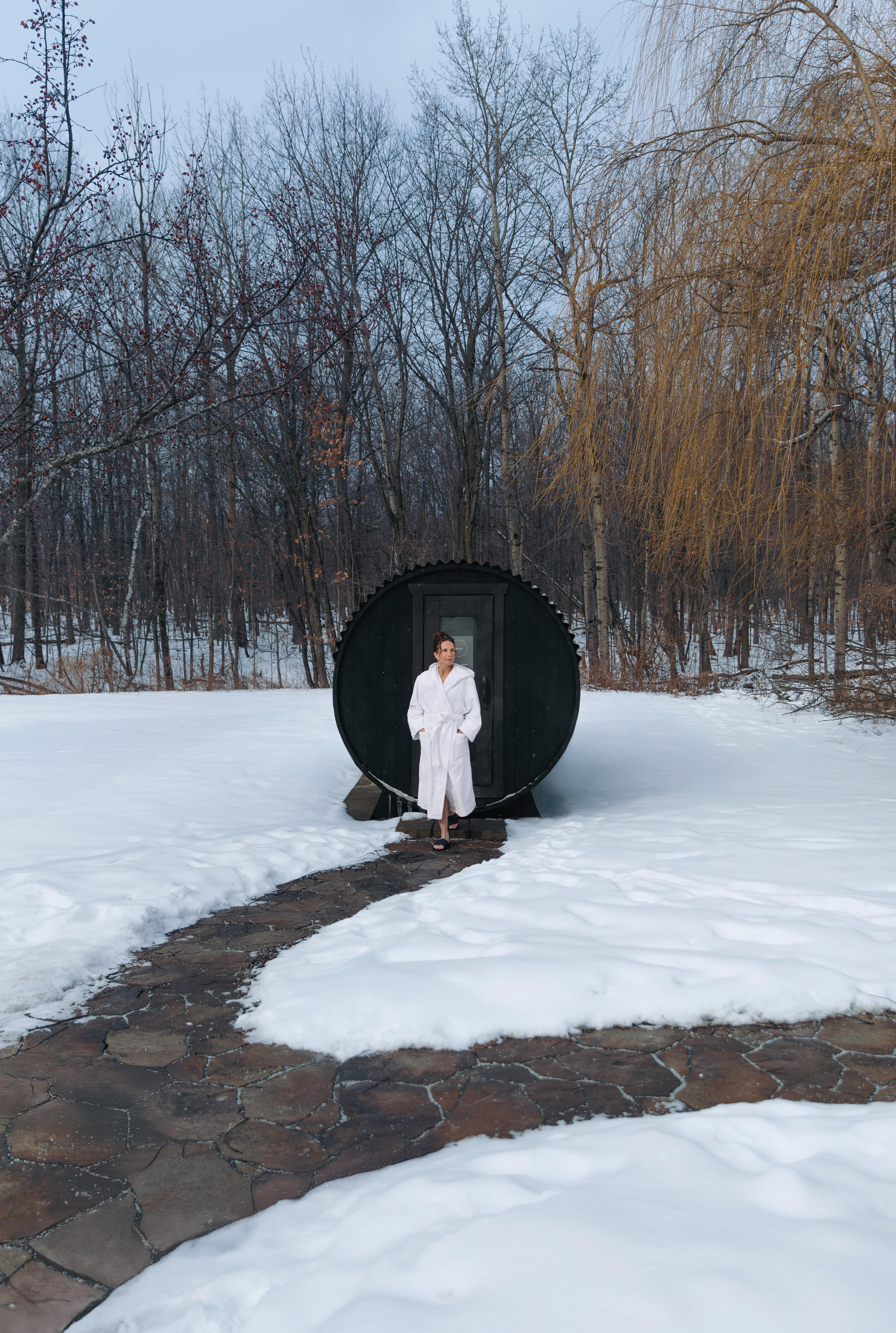 2. Winter appears like a painting in the background as you become one with the heat in the Finnish sauna.