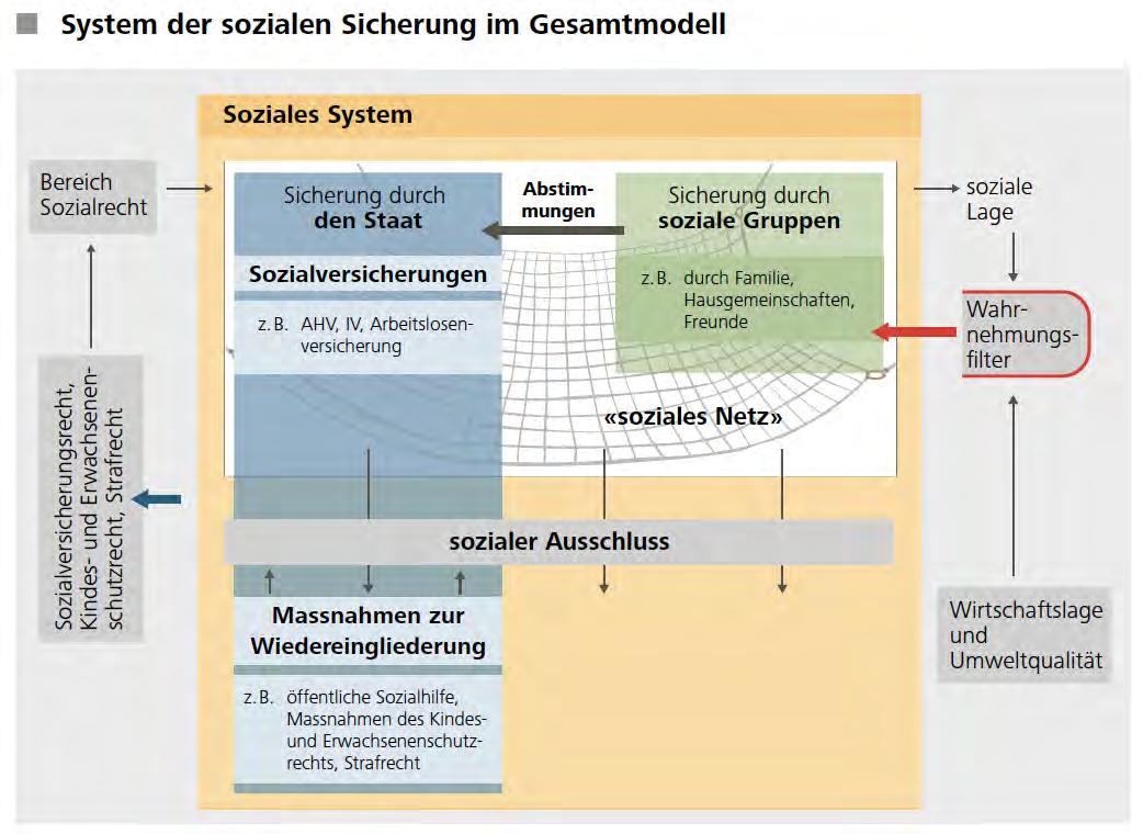 Der Schweizer Sozialwissenschafter François Höpflinger hat das Gesamtsystem der sozialen Sicherung in der Schweiz in einem Modell dargestellt. Er geht dabei von einem sozialen Netz im Zentrum der Gesellschaft aus. Dieses Netz soll Menschen davor schützen, in existentielle Not zu geraten.