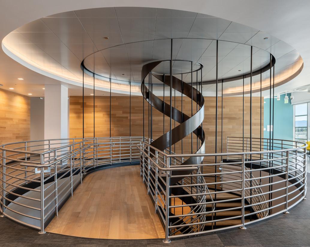 Salas O’Brien provided structural engineering design and consulting services for this artistic one-of-a-kind project. The heart of the project is the staircase connecting the fifth and sixth floors. The structural supports are both sculptural and kinetic, maintaining the spiral shape. In addition, threaded rod hangers enable the structure to remain the focus while creating the illusion that the stair is floating.