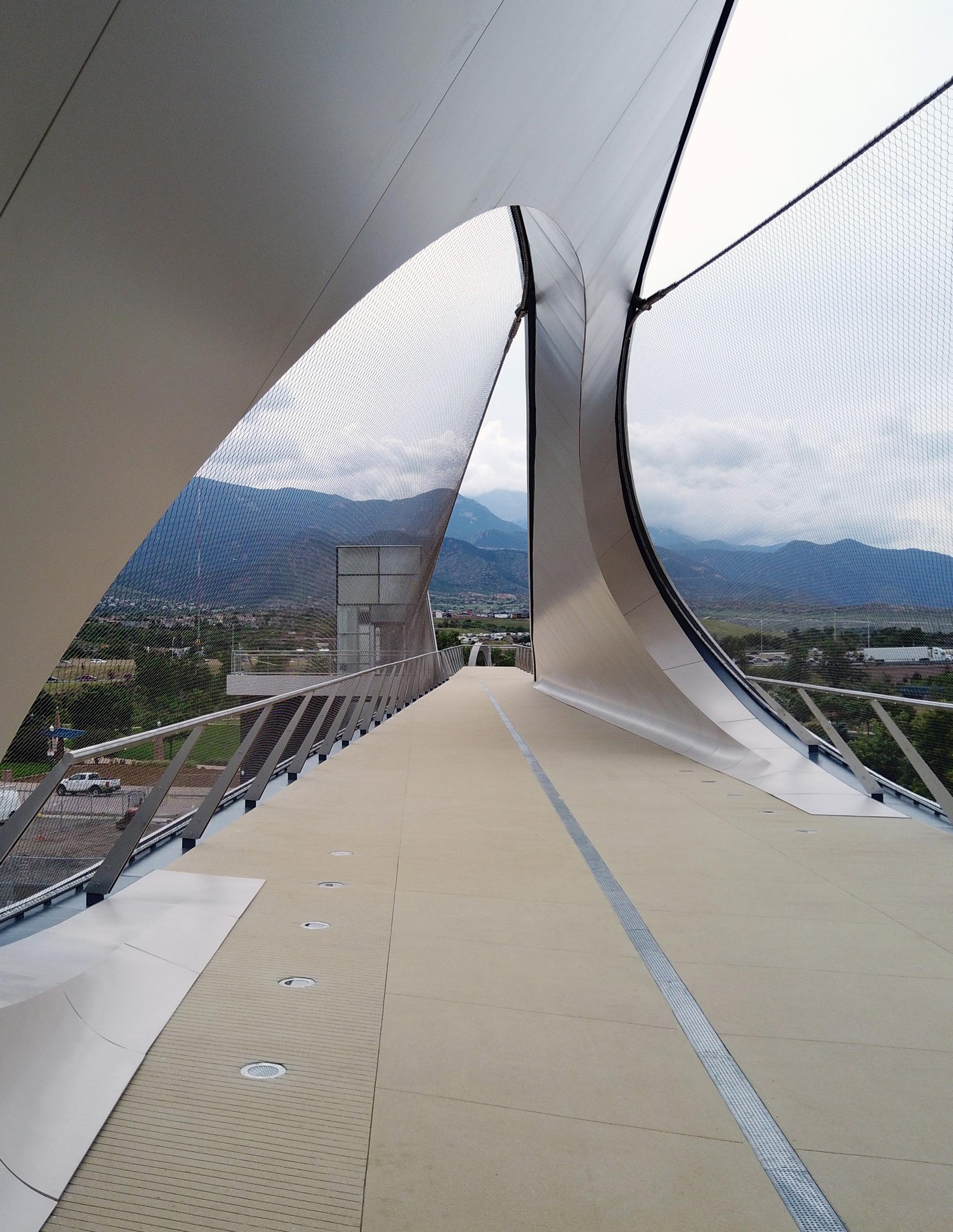 “The hybrid steel structure system functions as an arch and a truss, elegantly preserving views from Downtown to the majestic mountain ranges of Pikes Peak.”