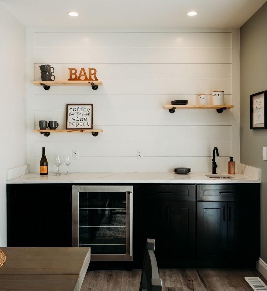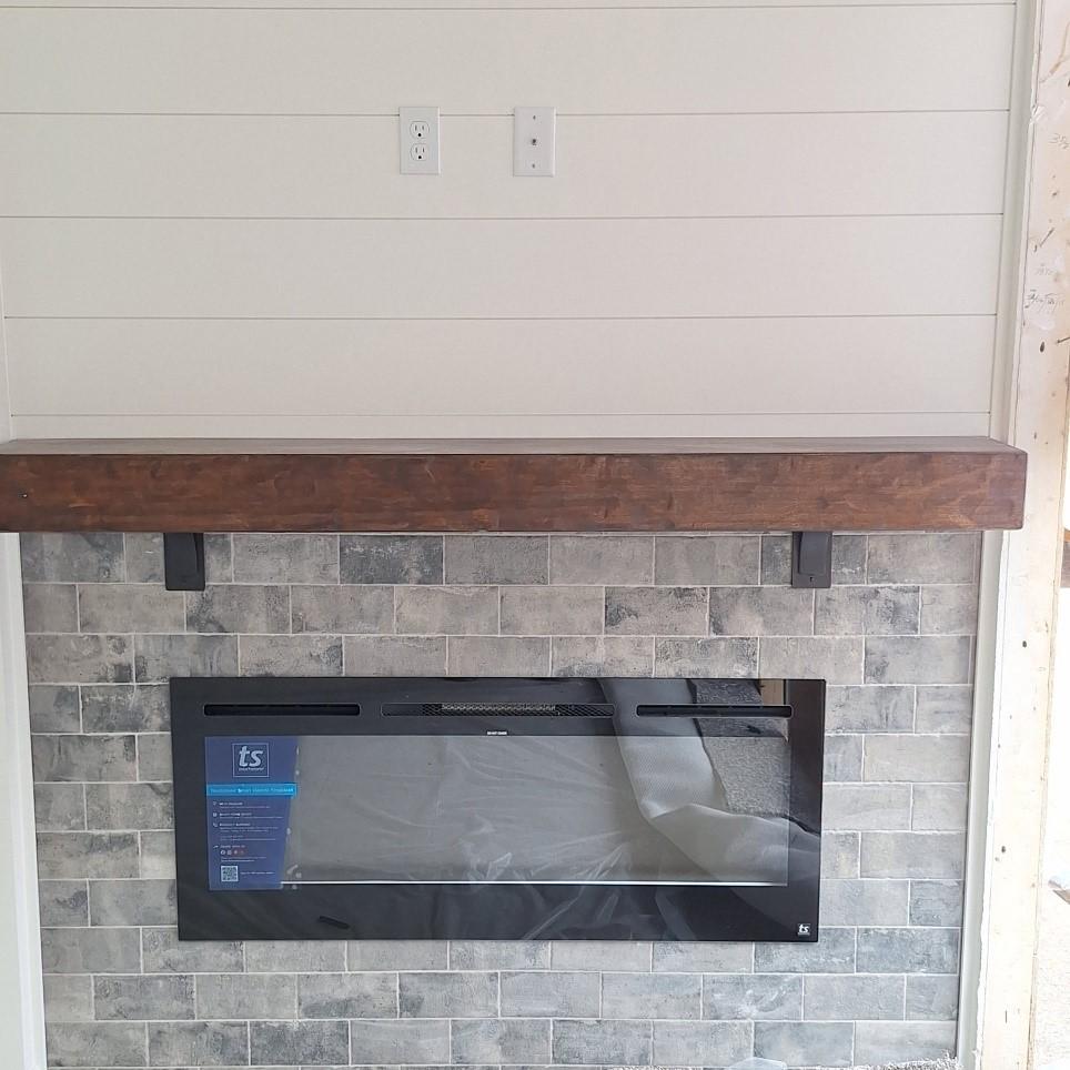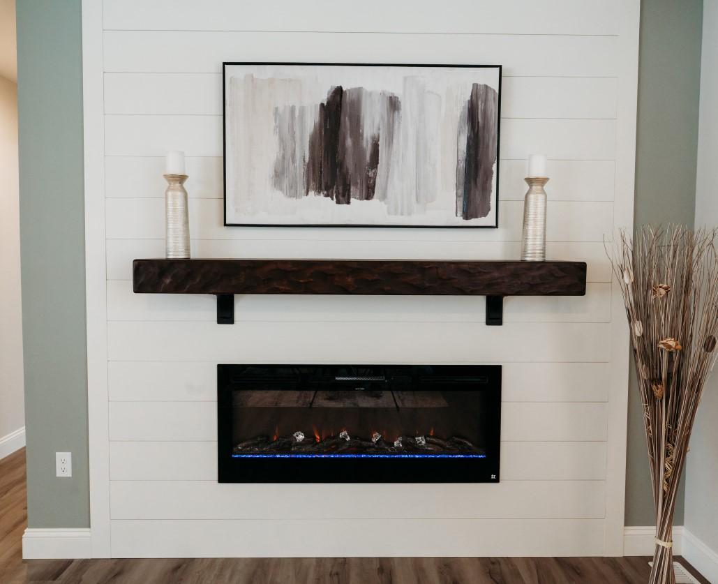 Fireplace with Tile and Shiplap Surround with a Wood Mantle