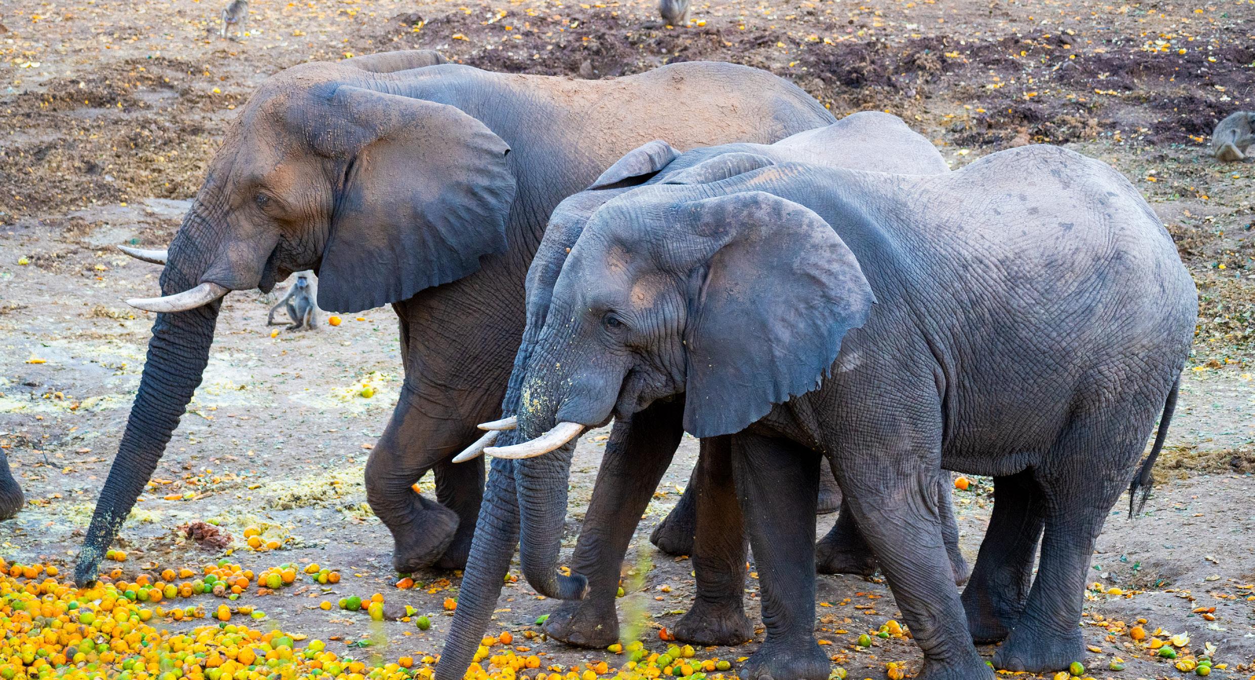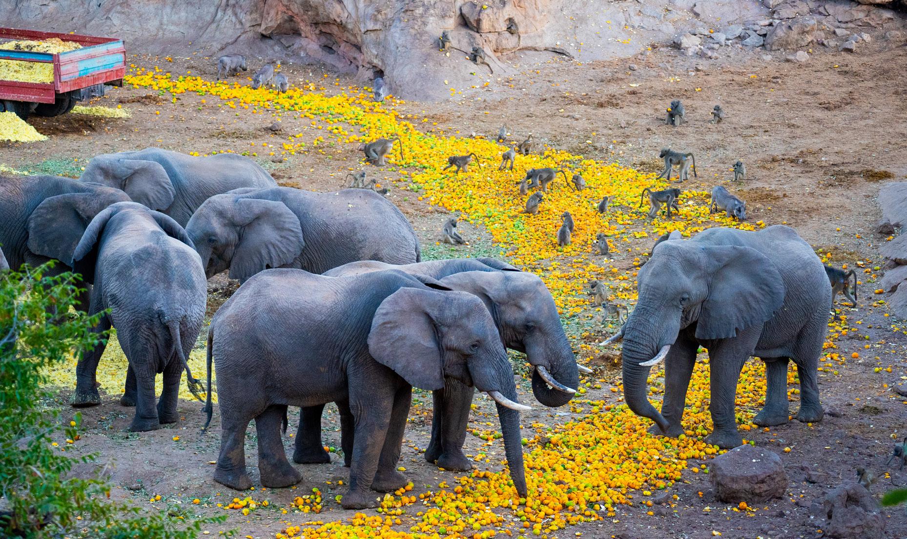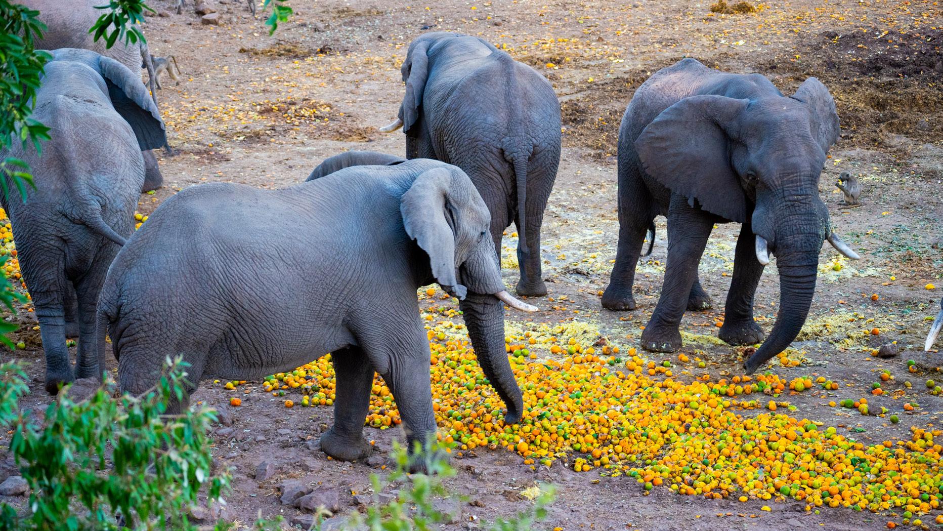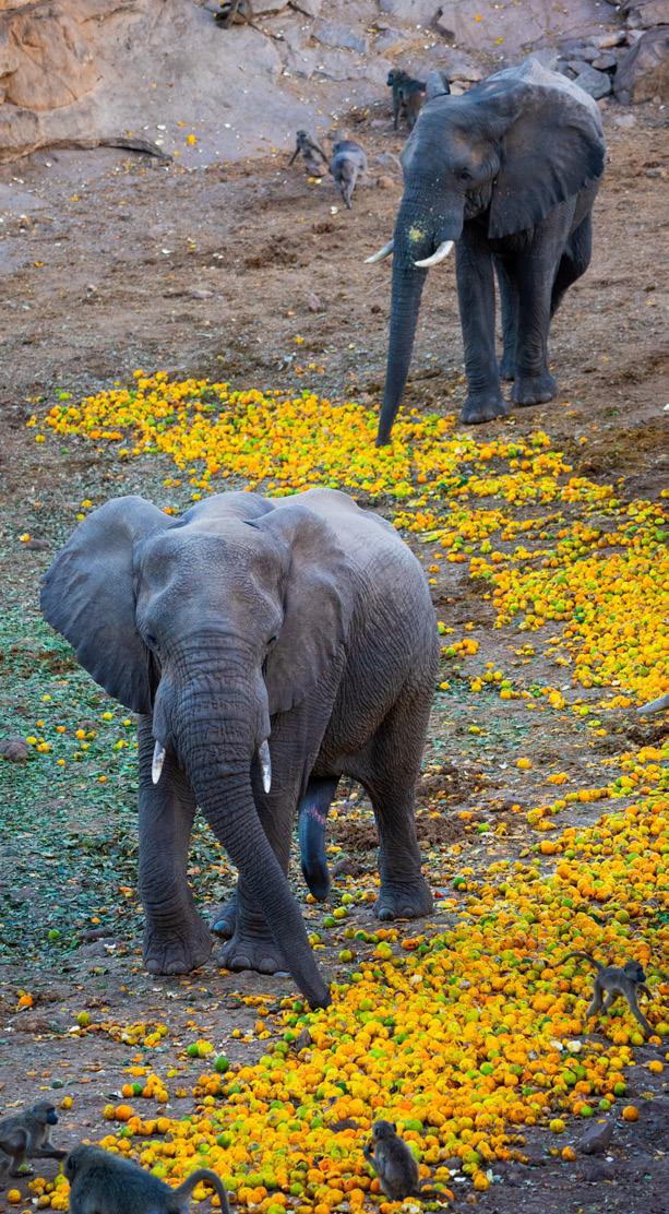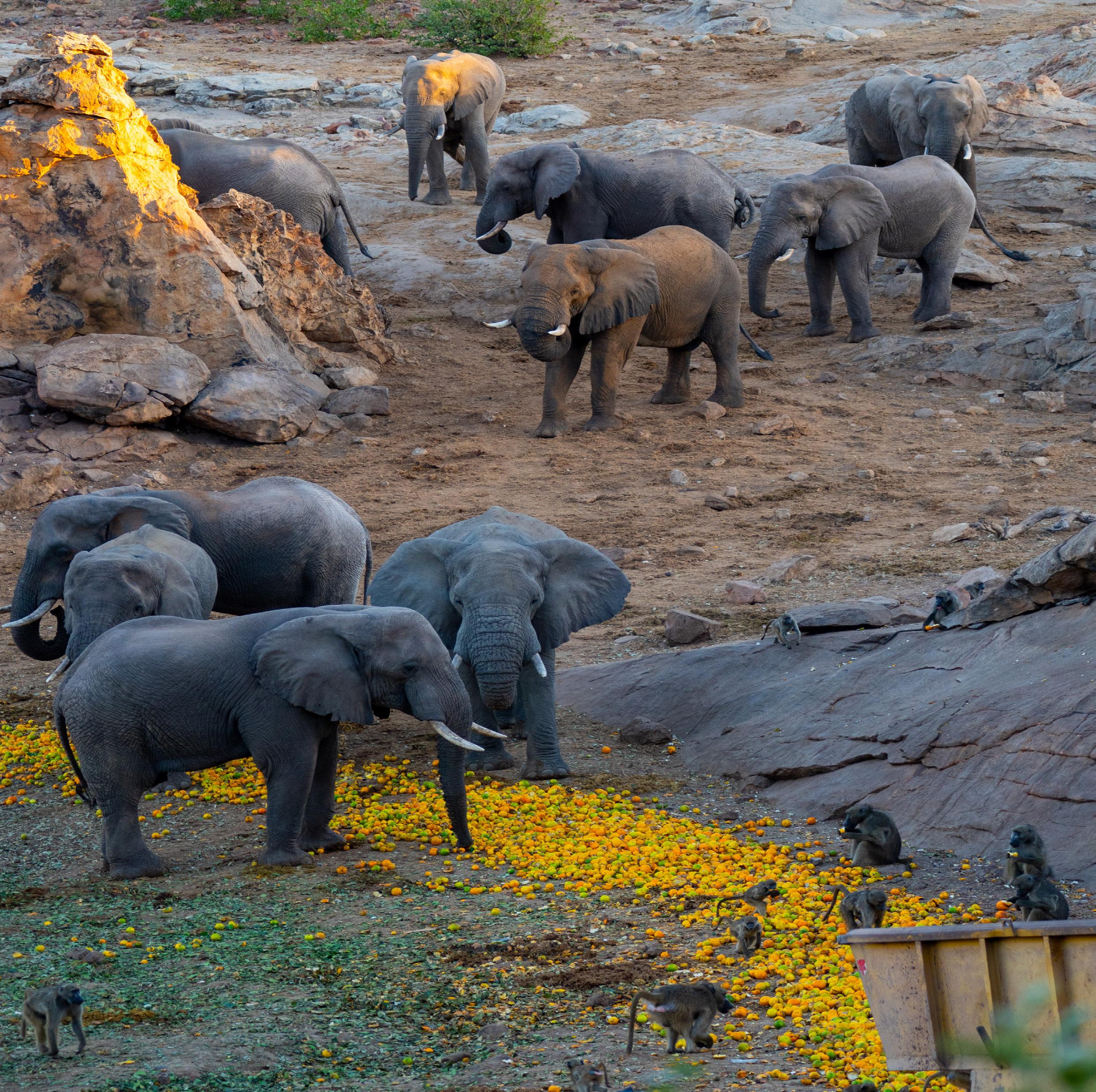 The camp allows guests to observe these magnificent creatures up close as they playfully devour discarded oranges. Other wildlife to be encountered, besides elephants, are kudu, impala, baboon, porcupine, eland, and warthog.