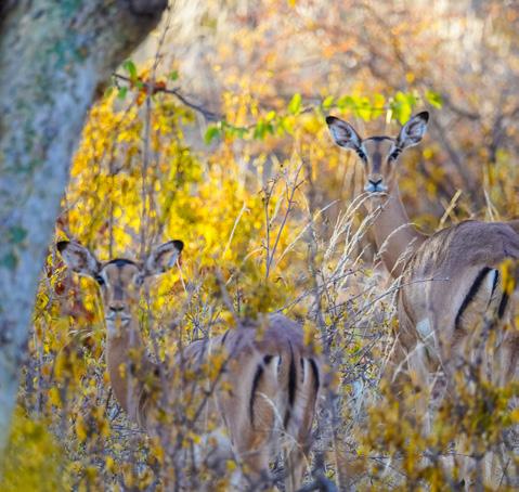 The lodge offers a choice of six airconditioned rooms with two, threequarter beds in each room or five Borrocs rooms, which only have fans, gauze windows, and their own swimming pool. These can sleep four, one person in each of the four, three-quarter beds. Guests can unwind by the pool, overlooking the river, or indulge in delicious meals served in a thatched lapa or under the shade of the Nyala tree.