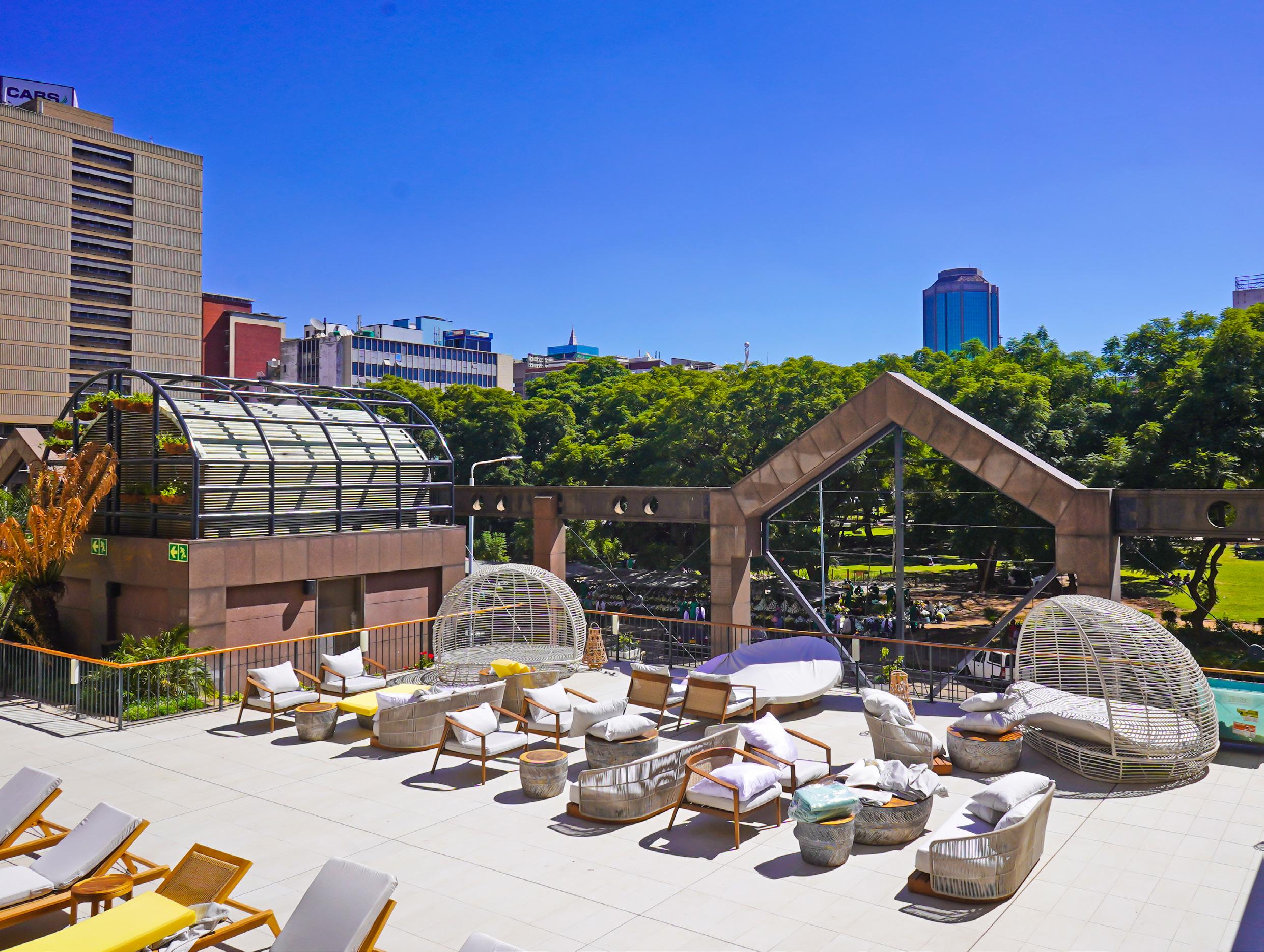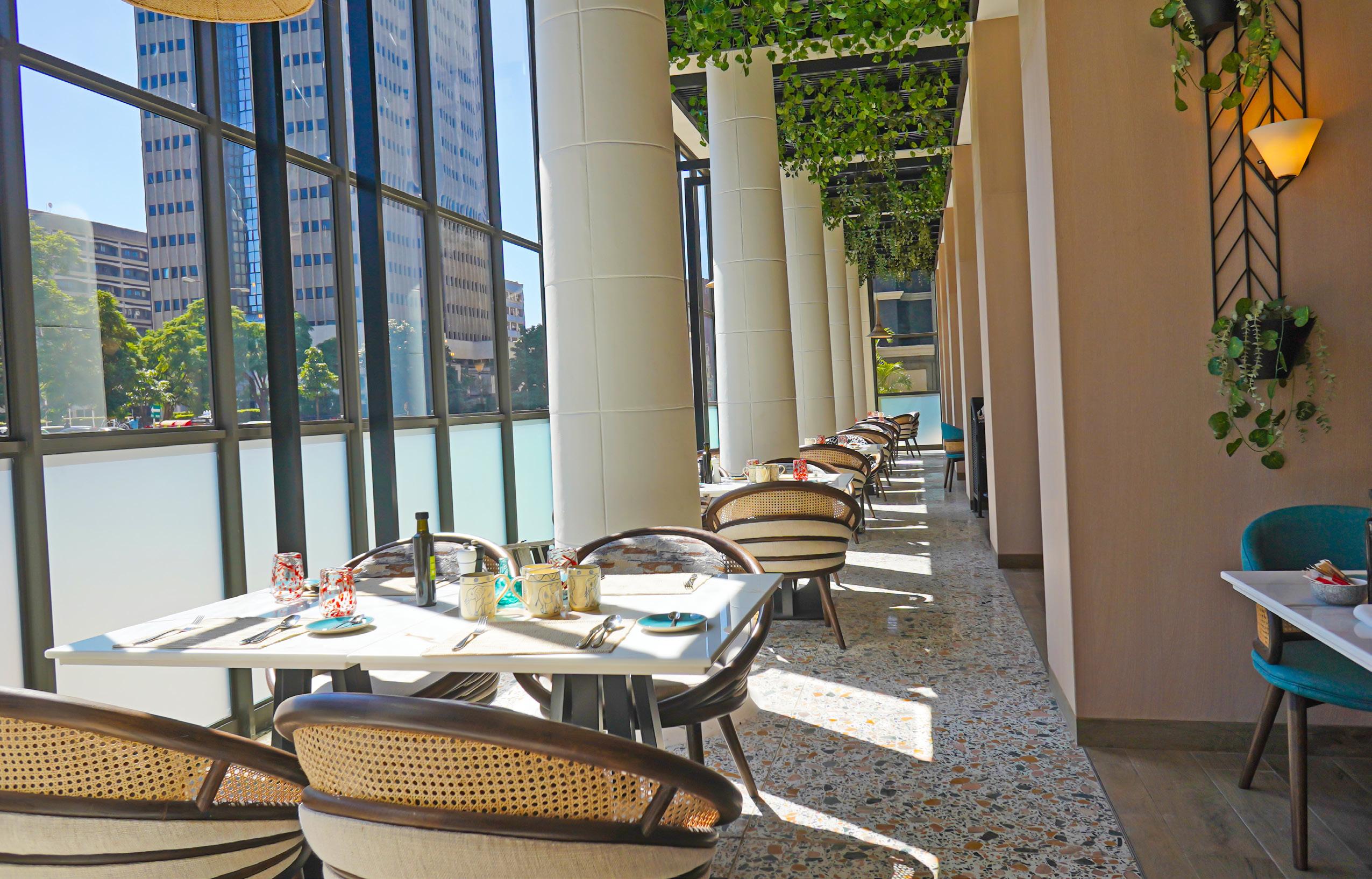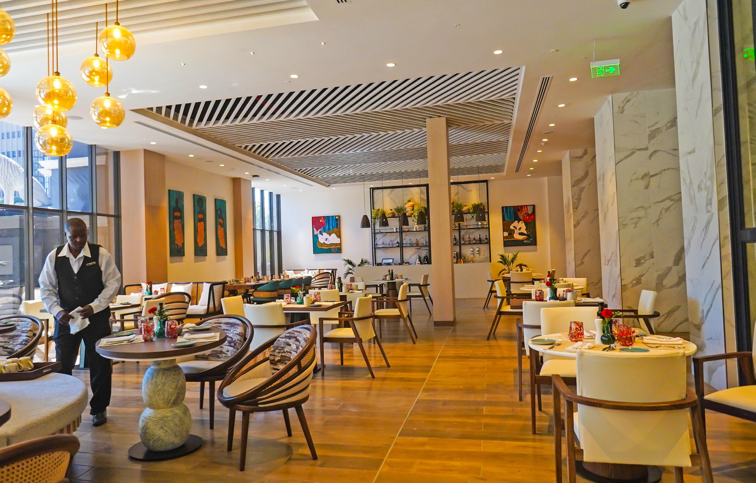 comfort.his theme of refined elegance extends to the restaurant overlooking Harare Gardens. White marble-top tables paired with teal upholstered chairs with curved backrests create a vibrant yet balanced atmosphere.