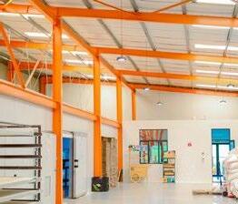 The exterior features a large warehouse park, comprising a massive, long building with a dark, corrugated metal roof, complemented by a smaller, separate turquoise-roofed structure.