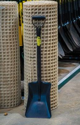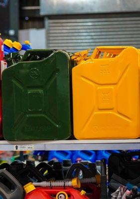 Basic essentials are organized neatly, from shovels and spades to fuel containers like the yellow, red, and green jerry cans, and large yellow rolls of robes and wires.