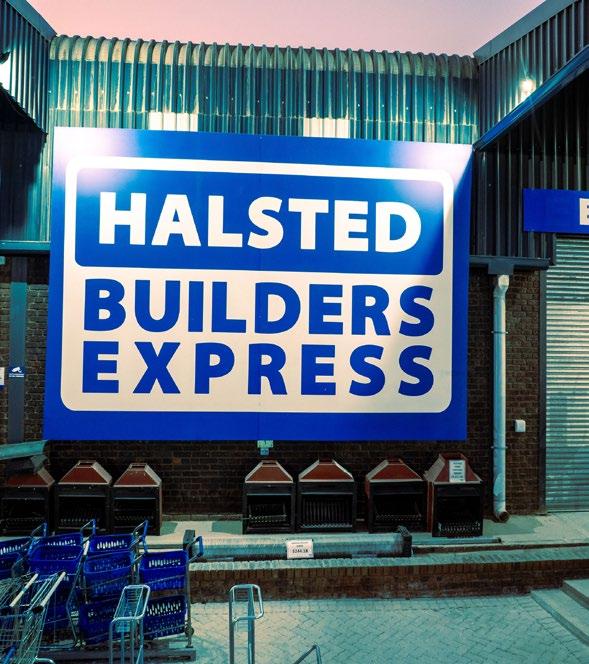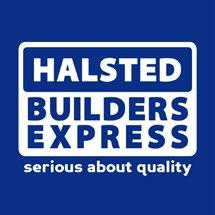 This large industrial footprint is situated alongside a major road, and the site is a true commercial hub, with the main entrance prominently displaying the illuminated "Halsted Builders Express" sign, sharing the complex frontage with other businesses like "House & Home," "Dees Pharmacy," and "Bakers Inn," creating a one-stop destination for various needs.