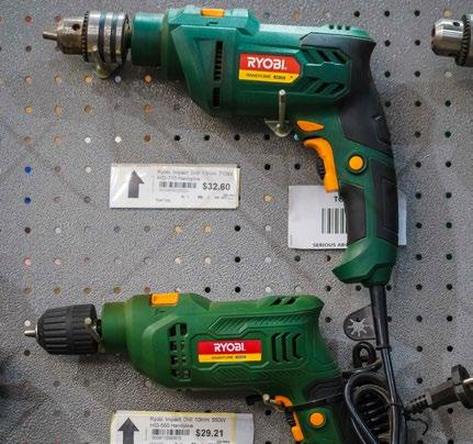 Essential equipment includes the power tools section, featuring drills, saws, and sanders displayed alongside safety gear like colourful hard hats and safety footwear, while smaller machinery like the bright blue lawnmower sits on dedicated shelving.