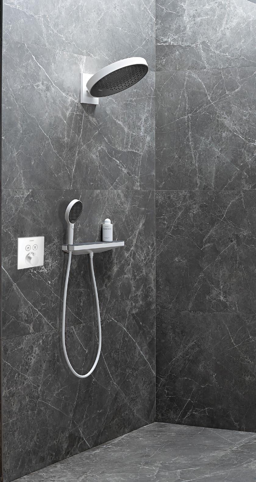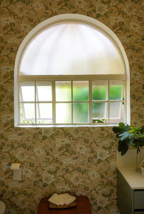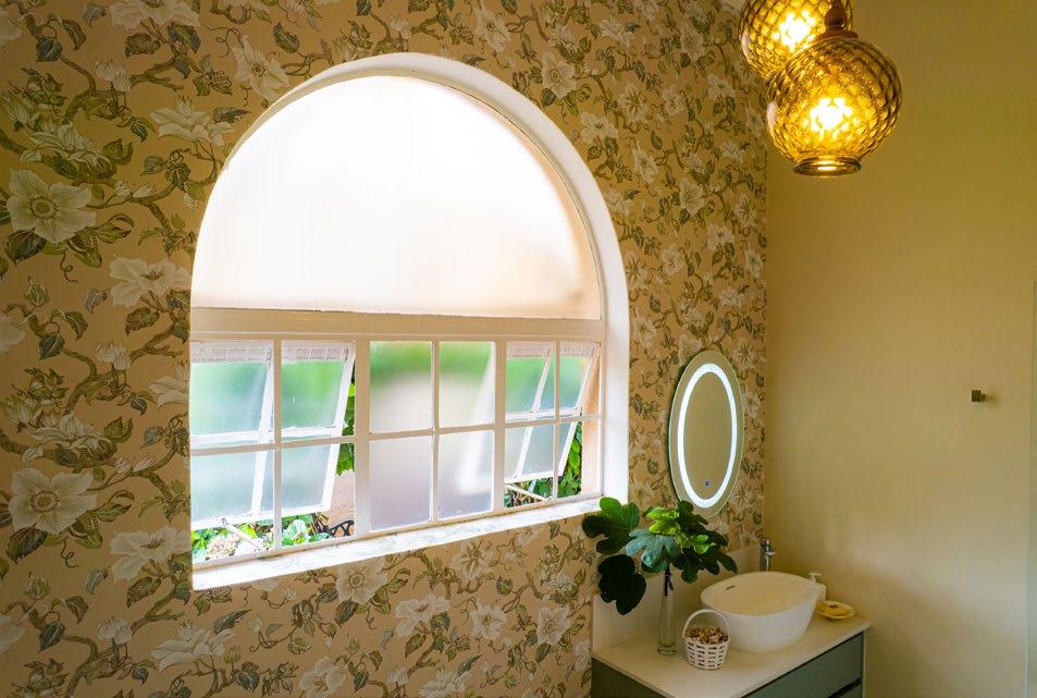 It’s lit by an arched window. The new bathroom contrasts with the master en suite bathroom which is totally monochromatic with grey wall and floor tiles.