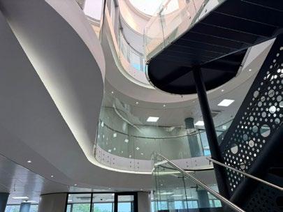 The building is designed to optimize daylight penetration, thereby reducing dependence on artificial lighting throughout the day. A defining feature is the bespoke skylight system formed from ETFE pillows which are specialized, air-filled membranes that provide superior thermal performance when compared to conventional glazing. These translucent cushions allow daylight to permeate the building’s central spaces while minimizing unwanted solar heat gain.