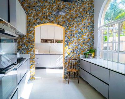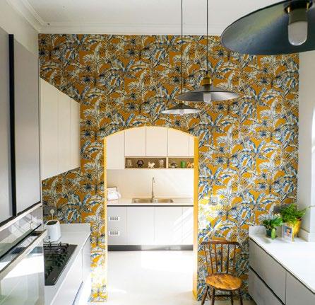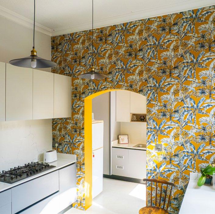 The wallpaper was installed in the kitchen (and bathrooms) by Guy Anderson from the company called Your Walls. The kitchen is very minimalist and modern but an antique Quaker style chair breaks the severity.