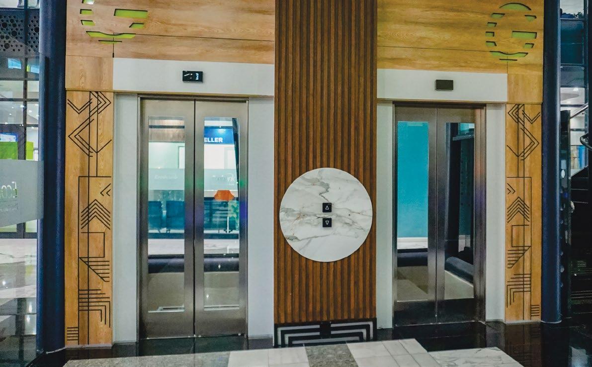 The lift is integrated into the building’s circulation core, ensuring that the elegant, flexible open-plan offices—finished with durable porcelain tiles and complemented by communal amenities like bright kitchenettes and sleek, fully-tiled public restrooms—are easily reached. Its presence is vital for the building’s functionality, catering to accessibility requirements and enhancing the flow of daily business. The elevator system offers swift, reliable access, and supports the high-end, functional interior design ethos, which includes clean lines, suspended ceilings, and carefully managed lighting.