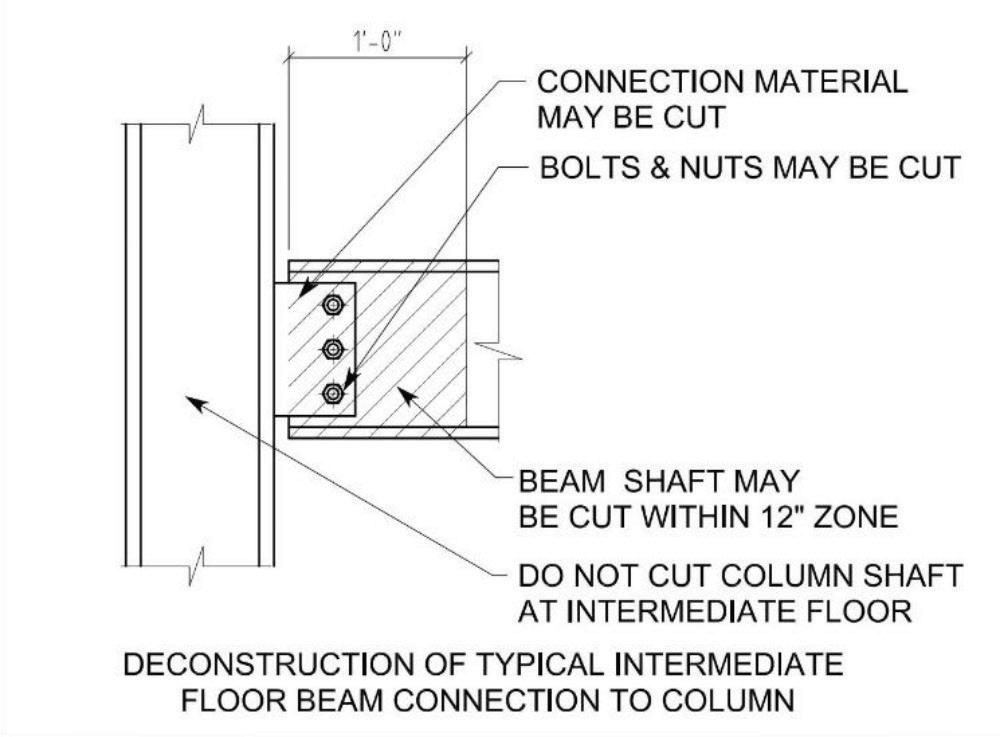 The order of operations varied between the two sources, primarily due to the availability of structural drawings for Source A and lack thereof for B. For example, fireproofing was removed from Source A steel, and each component was piece-marked to match the digital inventory before deconstruction. However, Source B fireproofing was removed in situ, further cleaned off while on the ground, then