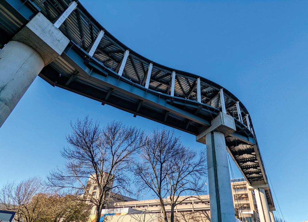 In addition to the Sphere itself, the venue features a 1,200-foot-long off-site pedestrian bridge with a unique serpentine pattern that connects the Sphere to the larger Las Vegas Strip. The bridge features a metal walking deck and a metal deck roof, founded on pipe piles just like the Sphere.