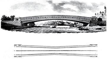 Wernwag claiming any further compensation therefore than the managers are now under contract to pay.” The final 340-foot 3-inch span far exceeded any bridge of its time. The deck width was variable with two carriageways and two sidewalks. At the top of the curve, the ribs were 13 feet 1 inch apart and 21 feet apart at the abutment. The overall width was 33 feet at the peak and 50 feet at the abutment. The rise of the lower chord/arch was 19 feet 11 inches. Wernwag summed up his report with, “The ribs, the cart-way, and the string-pieces, form so many arches, which are all connected and secured by ties, braces and bars of iron, in such a manner as to form one connected and combined whole, equal in strength, perhaps, to any thing that human ingenuity could devise. “ The Niles Weekly Register of January 23, 1813 wrote of the arches, “Each of these ribs is composed of six small ones, in thickness six inches, and of the average depth fourteen inches – the small ribs are placed on their edges, two in breadth and three in depth, and so formed as to be at the abutment equal to a solid mass of timber, four feet deep and one foot thick gradually diminishing in size, so as to be at the apex but three feet deep and one foot thick. They are prevented from coming into contact by one inch iron bars placed between them, six feet asunder, but are connected together by large iron bands also six feet apart, well secured, and susceptible of being drawn together as the timber dries, by strong screws.” On January 7, 1813, the bridge opened and Poulson’s Advertiser carried a brief notice when it stated, “On Thursday last the centres were removed from this beautiful edifice in the presence of a large concourse of people – when was exhibited an arc of three hundred and forty feet three inches straight cord; being ninety six feet longer than any single arc in Europe or America. This truly elegant structure was completed thus far in eight months, and rests upon stone abutments of vast solidity, containing together 7000 perches of stone.” The bridge to this date cost a total of $64,500 including the cost of property and monies given to the ferry companies. It was estimated that the rest of the construction including covering would cost $20,550. Shortly after removal of the scaffolding, the northerly wingwall of the westerly abutment cracked. It was clear that the wall was being pushed northerly by the backfill material. In spite of this problem, on March 13, 1813, the Board determined that “it is expedient to roof and finish the bridge” and selected Robert Mills as their designer and builder. He proposed a very decorative siding and roofing and was given the contract to enclose the bridge and build the tollhouses for the sum of $4,520, not including the cost of materials. His proposal and contract were very detailed, with a circular toll house to be built with a colonnade surrounding the walls. The work was to be completed within six months. Apparently something was still going wrong on the northerly wingwall on the westerly abutment, and Wernwag was called in to remove “the defect in the bridge” which he did with great effort. By early May, however, another problem developed that caused Wernwag and the managers a great deal of alarm. The westerly abutment face, which up to this time was stable, started to shift. The northerly end rotated about the southerly end, causing the two northerly ribs to rise up in the middle. The Board wrote, “Mr. Wernwag, is, at his own proper cost removing the earth from behind the abutment, with an expectation that the weight of the Bridge upon the wall will bring the piles to their original bearing: In this experiment, the managers have no very great confidence. It was due however to Mr. Wernwag to suffer him to make the trial.” He was successful in this effort and the managers wrote, “It was reserved for the genius of America to throw a single arch over a river, three hundred and forty feet wide, without any other support than its abutments, for in no part of the old world can such an instance be shown. ” The Board commissioned a drawing of the bridge by William Strickland to be part of the final Report. One of the most copied images of the bridge was Birch’s. It was reproduced on Staffordshire China and many versions of it reproduced in European books. Its title as the longest span lasted until 1815, when Theodore Burr built his McCall’s Ferry Bridge, was reclaimed when Burr’s bridge was taken out by ice in 1818. The bridge lasted until September 1, 1838 when it was consumed by fire after a life of only 26 years. The directors were anxious to rebuild the bridge but lacked the finances to do so for several years. In 1842, Charles Ellet, Jr., on the same site, built the Fairmount Suspension Bridge. Its central span was 358 feet and it was the first major wire cable suspension bridge in the United States, lasting until 1870. It was replaced with an iron bridge by Jacob Hays Linville. The span, along with its beautiful covering, resulted in the bridge being called the Colossus after the famous Colossus of Rhodes Statue, one of the Seven Wonders of the Ancient World. It is likely that Wernwag himself named it the Colossus, as on his 1813 Broadside he calls it his Patent Bridge Colossus. Wernwag’s accomplishment was to build the longest single span bridge in the world in just over eight months, with the woodwork taking only three months. Fletcher and Snow wrote in their 1934 Transactions ASCE article on “A History of the Development of the Wooden Bridges” that “this bold design, scientific and architecturally beautiful, probably was never surpassed in America.”▪