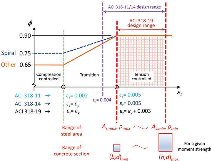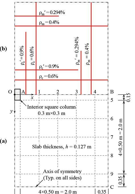 For the flat plate considered, ACI 318-19 requires a minimum slab thickness = ln/33 = 5.63 inches (143 mm). The code allows the chosen thickness 5 inch (127 mm) thickness because calculations showed its adequacy for the punching shear strength at the slab-column connections and the long-term deflection. Table 3 shows that the flexural reinforcements in Fig. 1b satisfy the flexural strength requirements under gravity and earthquake loads of the code.