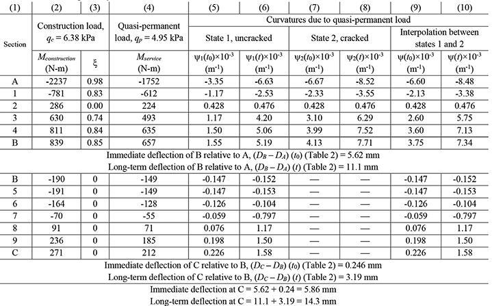 The computer program EGRID (Gayed and Ghali 2022) idealizes the flat plate panel as a grid of torsionless beam elements; the results of the analysis are in Table 1 (columns 2 and 4). Deflections at times t0 and t are calculated in Tables 1 and 2; the immediate and long-term deflections at Point C are 0.231 and 0.563 in (5.86 and 14.3 mm), respectively, corresponding to span/853 and span/350, respectively. For slightly longer spans, larger deflection can be counterbalanced by camber in the formwork.
