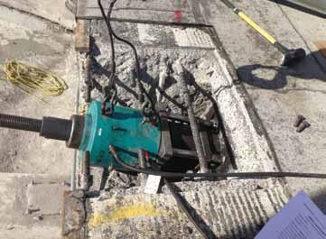 Accurate design requires precise knowledge of the existing structure. As the cables act in a non-linear manner, simple structural analysis methods do not generate accurate results. Possessing the original structural drawings without having the sequencing of the cable erection and jacking, and the original pre-tensioning magnitude, was insuffi cient to accurately model the structure. As the original sequencing and jacking forces of the cable structure were not available, further investigation was necessary. Knowledge of the exact cable location in its current state, and an inventory of the existing loads supported by the cable along with the precise amount of force currently in the cable was required to accurately model the structure in absence of the original sequencing. Measuring the cable locations in space was easily achieved with a 3D laser scan of the ceiling. Th is provided information on the location coordinates of all cables for the entire roof. Finding the existing force in the cable was more complicated, requiring a ‘lift off ’ test of the cable. Th e ends of the existing cables were concrete encased at the completion of installation. During the ‘lift off ’ test, the concrete encasement was chipped away, exposing the end wedge fi tting of the existing cable. A jack with a custom threaded and fabricated pin was used to engage the cable end. Th e cable end