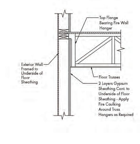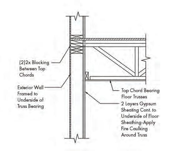 Advantages of this approach are reduced costs associated with truss connection hardware to the exterior wall, the ability to utilize typical rated assemblies to demonstrate the required FRR, and the use of conventional lumber to provide solid blocking to the underside of the floor sheathing above. Disadvantages are unique exterior wall plate heights relative to the interior ceiling height, limited spans of floor trusses due to the allowable capacity of top chord bearing trusses, and the addition of multiple flat plates into the exterior wall assembly which will increase overall building shrinkage.